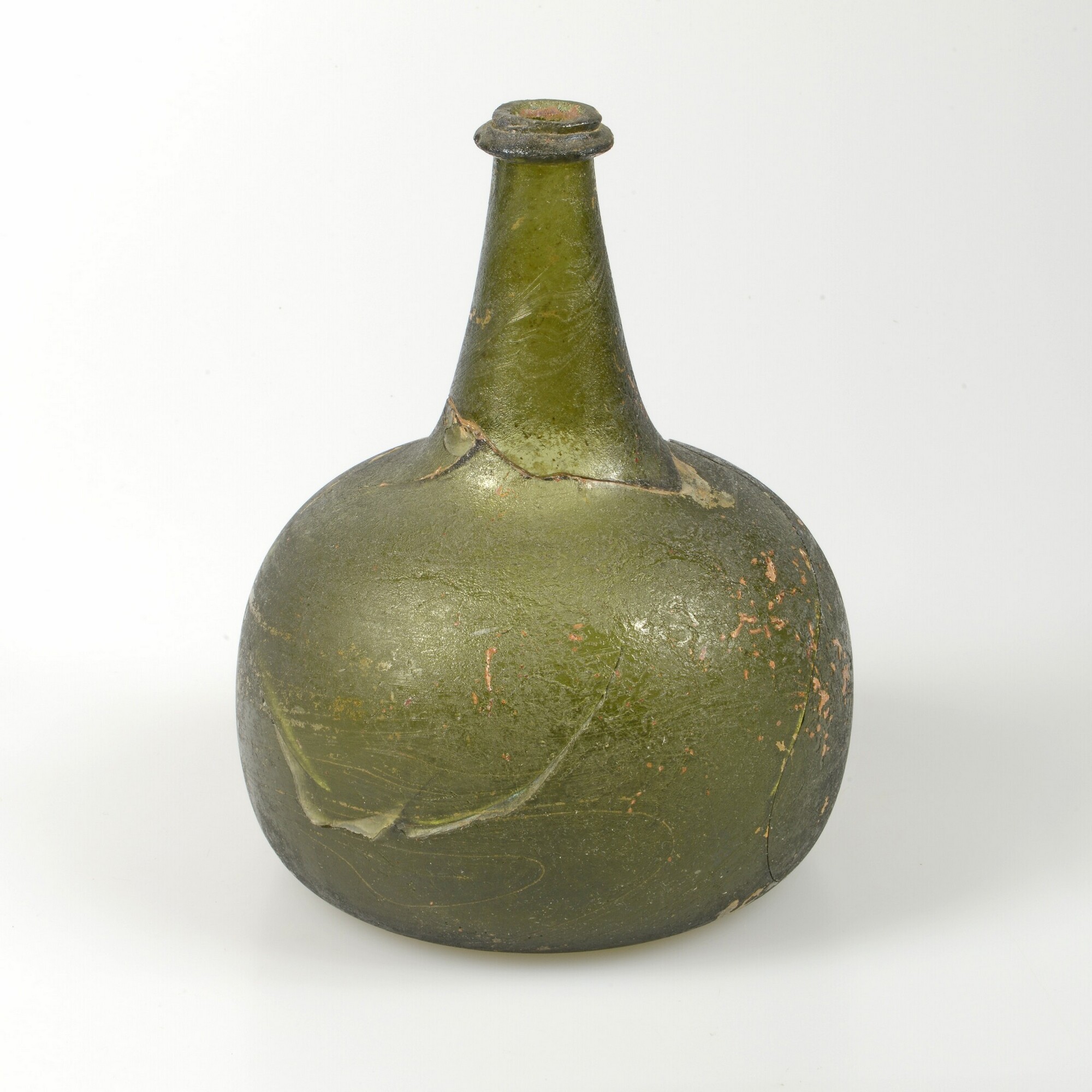 Wijnfles:hoge hals, opgebolde bodem