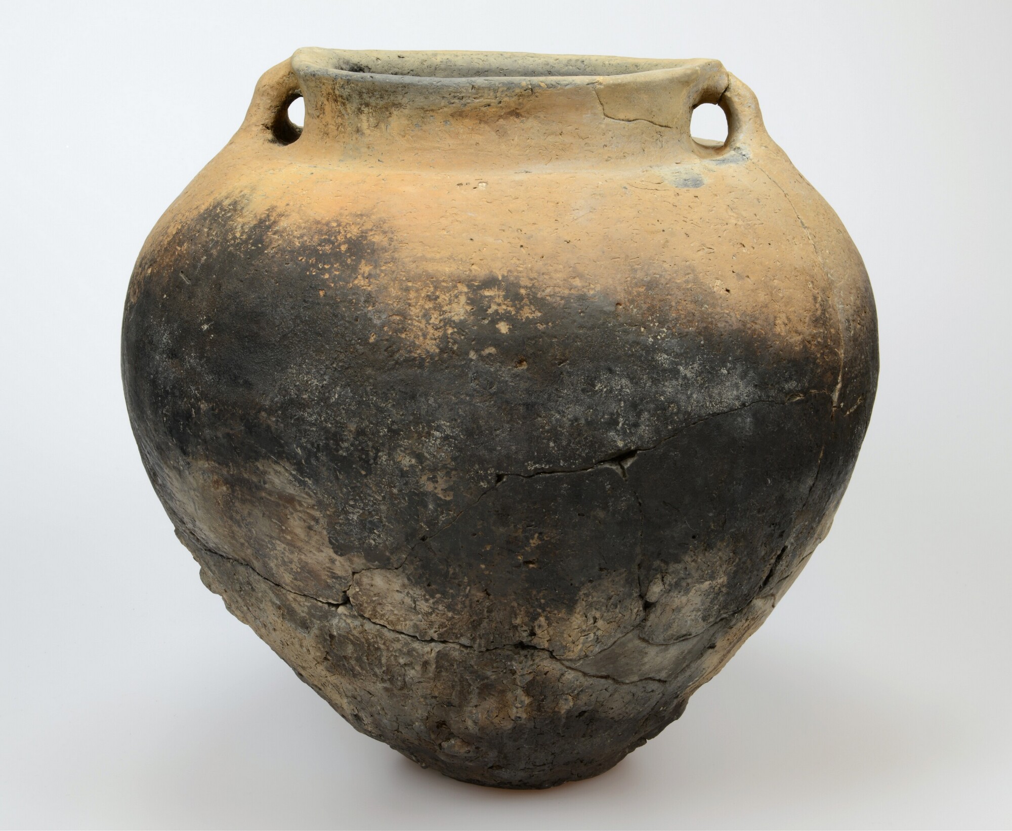 Nauwmondige orenpot; inheems-Romeins aardewerk; handgevormd; bolvormig potlichaam met een groef op de schouder en een rechtopstaande rand die iets naar buiten staat; glad van boven en besmeten aan de onderzijde; standvlak; roetsporen