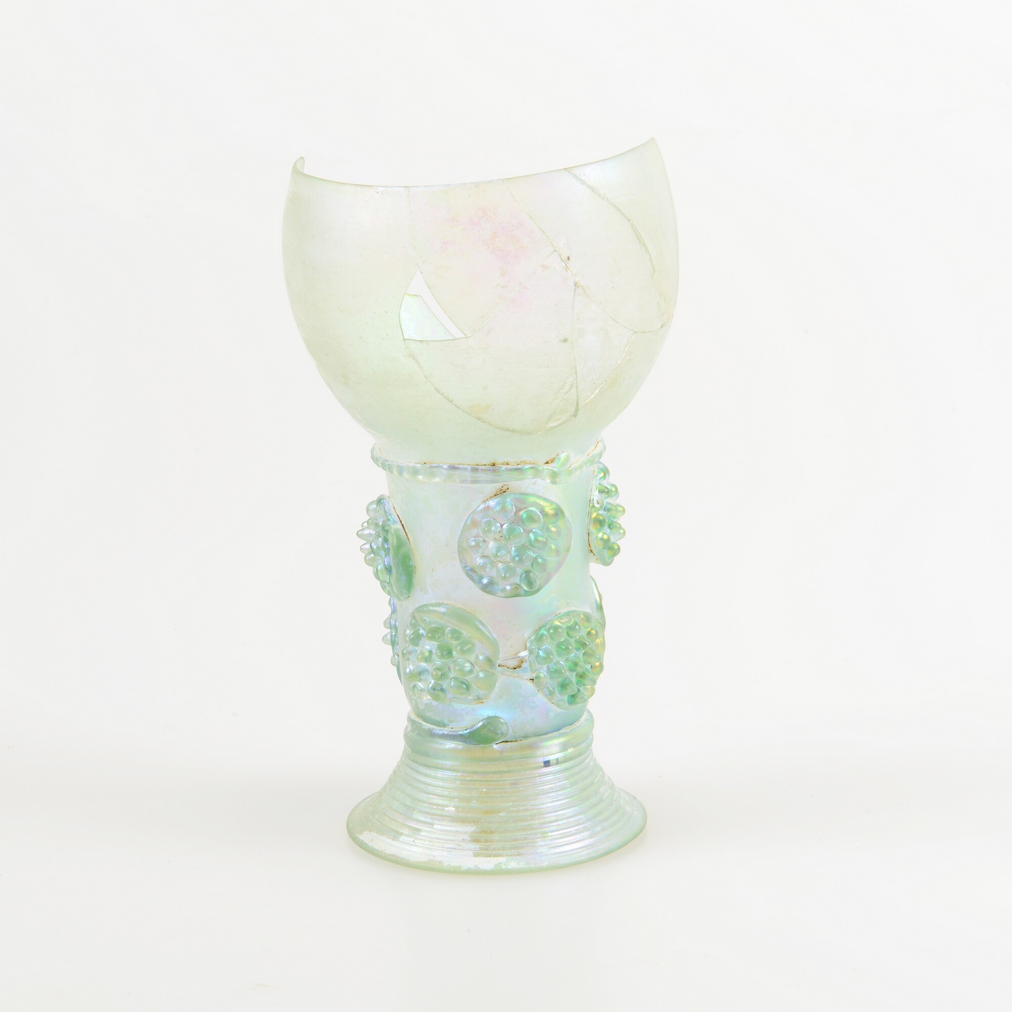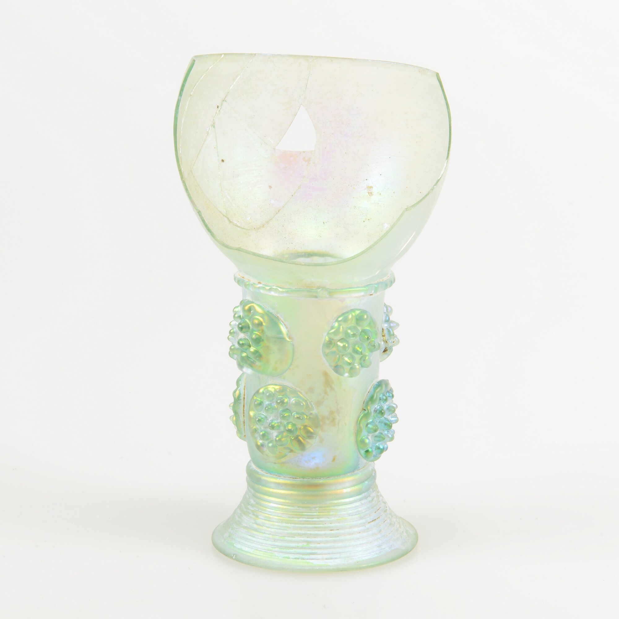 Roemer; gl-roe-2; groen glas; een deel van de cuppa ontbreekt; twee verspringende rijen van vier braamnoppen op de schacht; hoge gewonden glasdraadvoet met opgestoken bodem en pontilmerk; herkomst: Duitsland of Nederlanden; vondstomstandigheden: beerput I, 19-12-1987