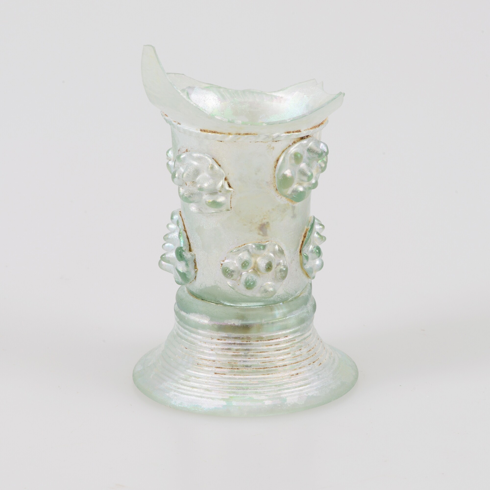 Roemer; gl-roe-2; groen glas; vrijwel de gehele cuppa ontbreekt; twee verspringende rijen van vier braamnoppen op de schacht; hoge gewonden glasdraadvoet met opgestoken bodem en pontilmerk; herkomst: Duitsland of Nederlanden; vondstomstandigheden: beerput I, 19-12-1987