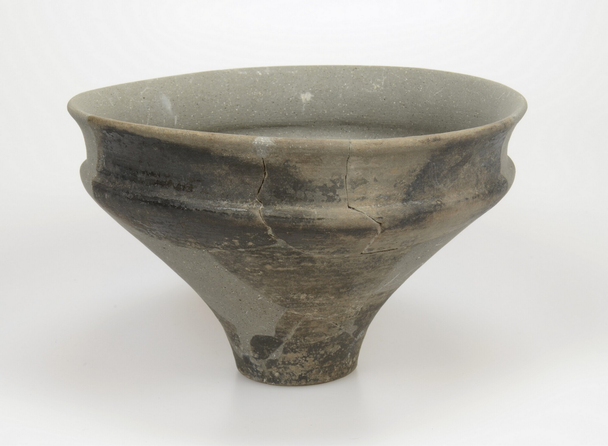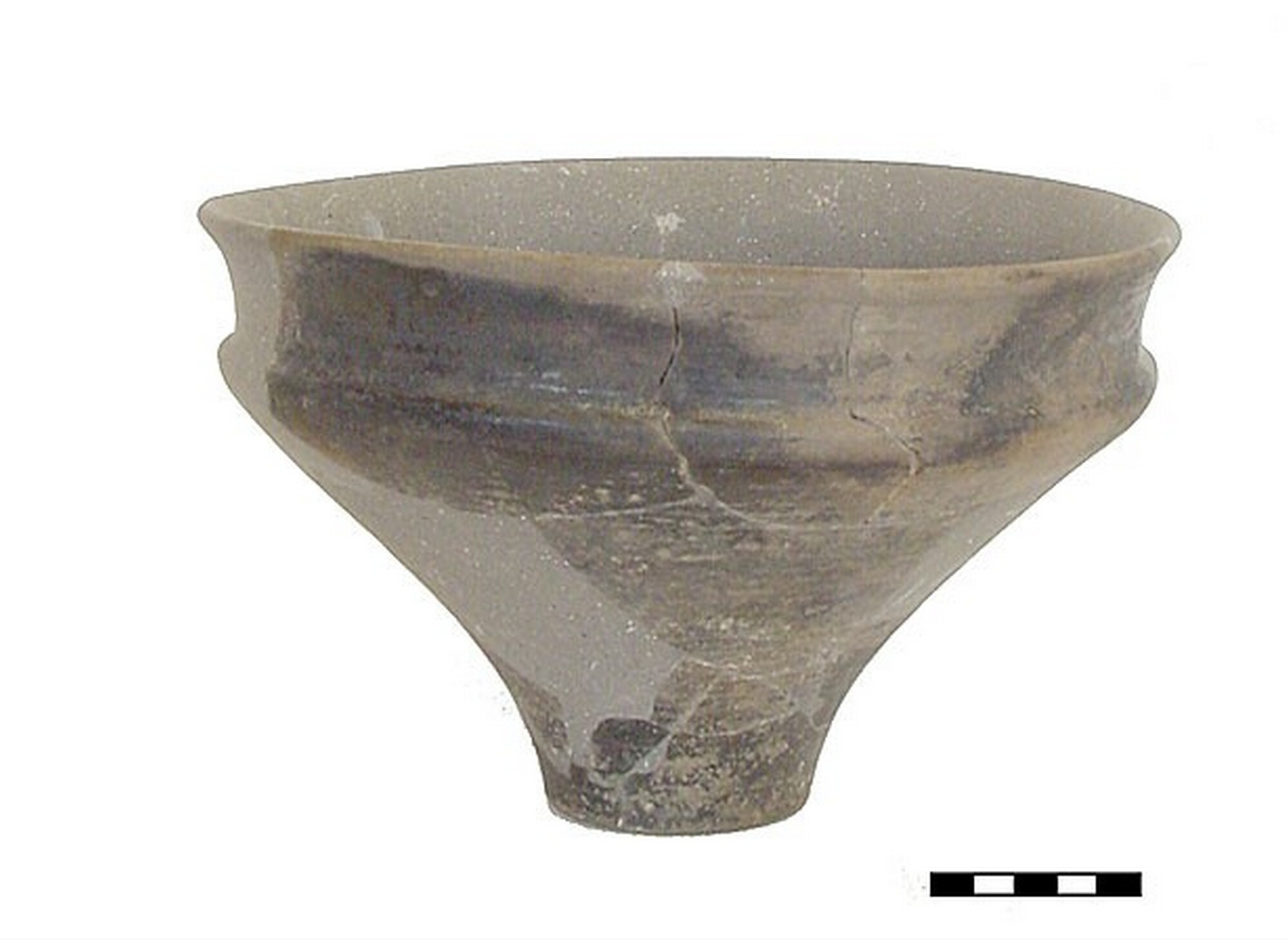 Situla/kelkpot; type D-III; blauwgrijs gedraaid aardewerk; wijdmondige vorm met een licht gebogen hals die scherp is afgezet op de korte, iets verdikte schouder. De buik loopt concaaf naar de eenvoudige holle voet; gepolijst