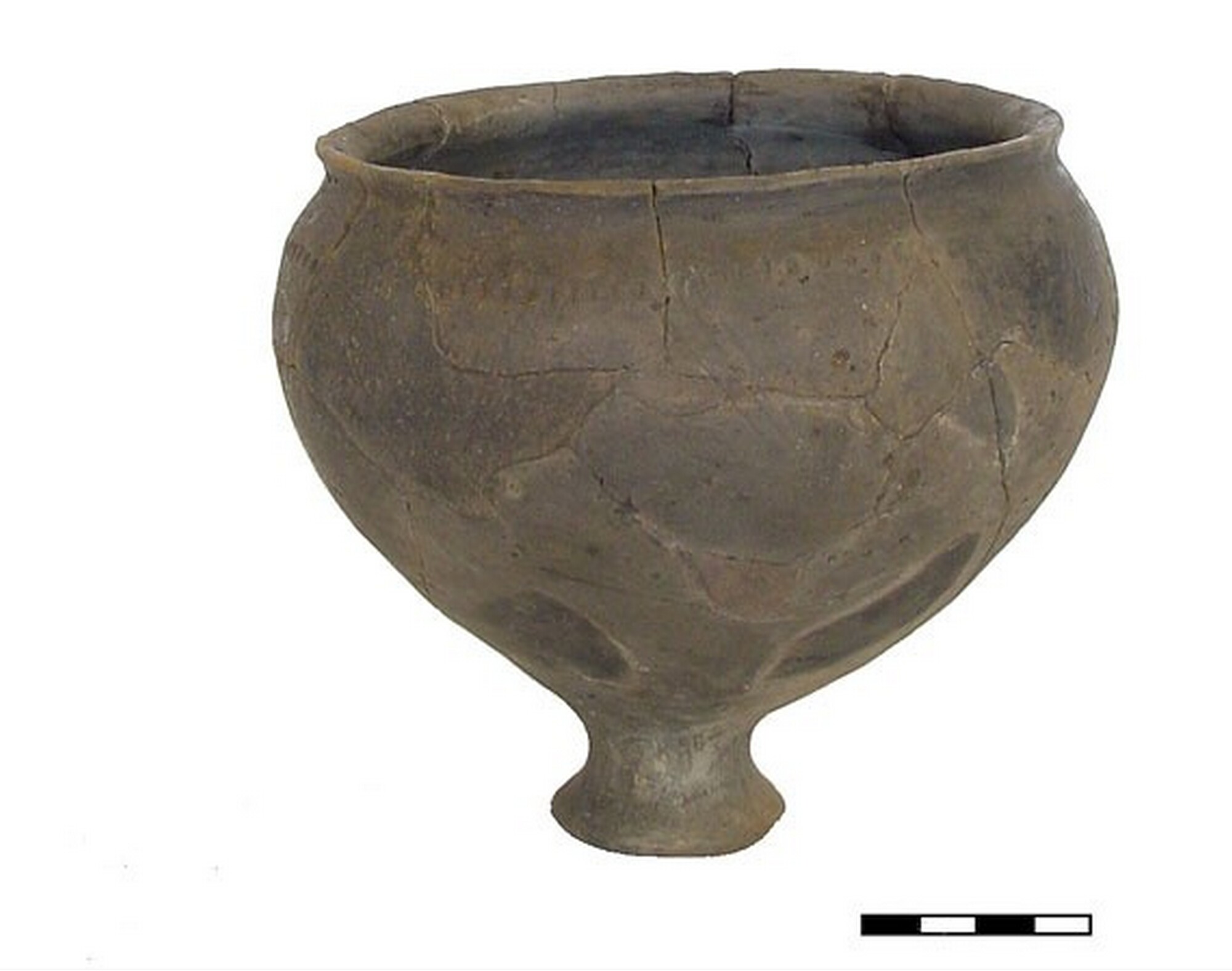 Situla/kelkpot; type Diederik F-V; inheems-Romeins aardewerk; handgevormd; wijdmondige situla op een stengelvoet met punt- en lijnversiering net onder de rand; holle standvoet