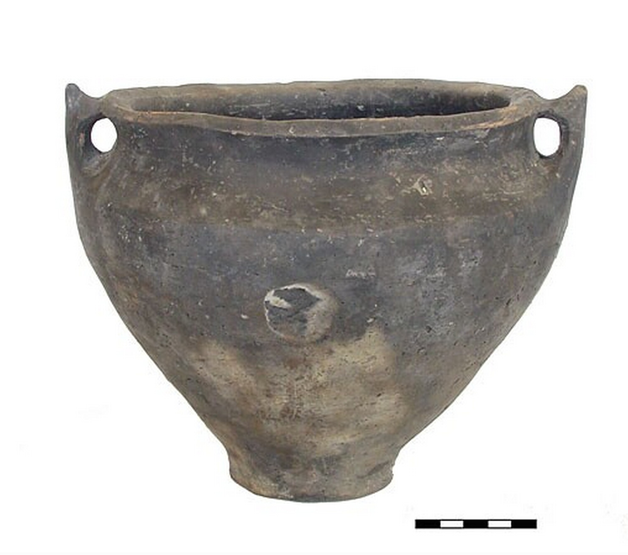 Pot; type Diederik F-II; inheems-Romeins aardewerk; handgevormd; wijdmondige lage pot met twee, net boven de rand uitstekende knobbeloren; standvlak; geglad oppervlak; potgruismagering
