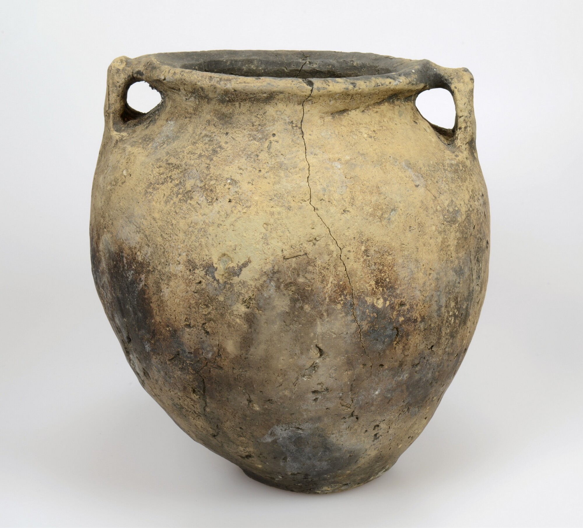 Pot; type Diederik F-III; inheems-Romeins aardewerk; handgevormd; nauwmondige slanke pot met twee knobbeloren; standvlak; inwendig roetsporen