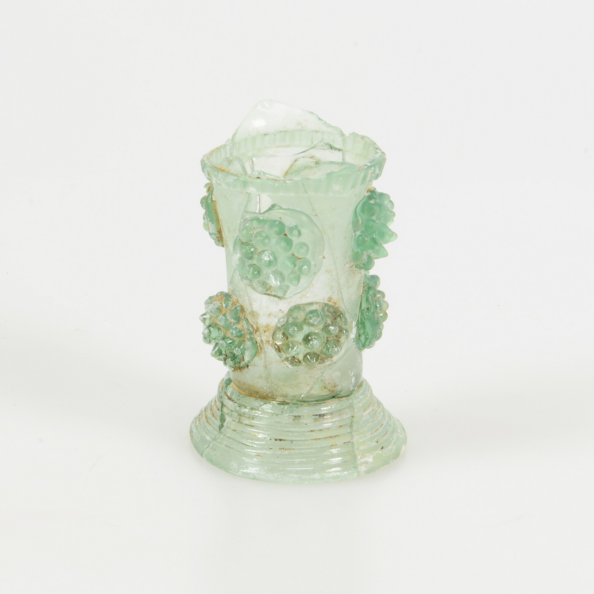 Roemer; gl-roe-; fragment roemer met twee rijen braamnoppen, geribde glasdraad boven de noppen, smal, opgestoken bodem met pontilmerk, gewonden draadvoet; lichtgroen; herkomst: Duitsland