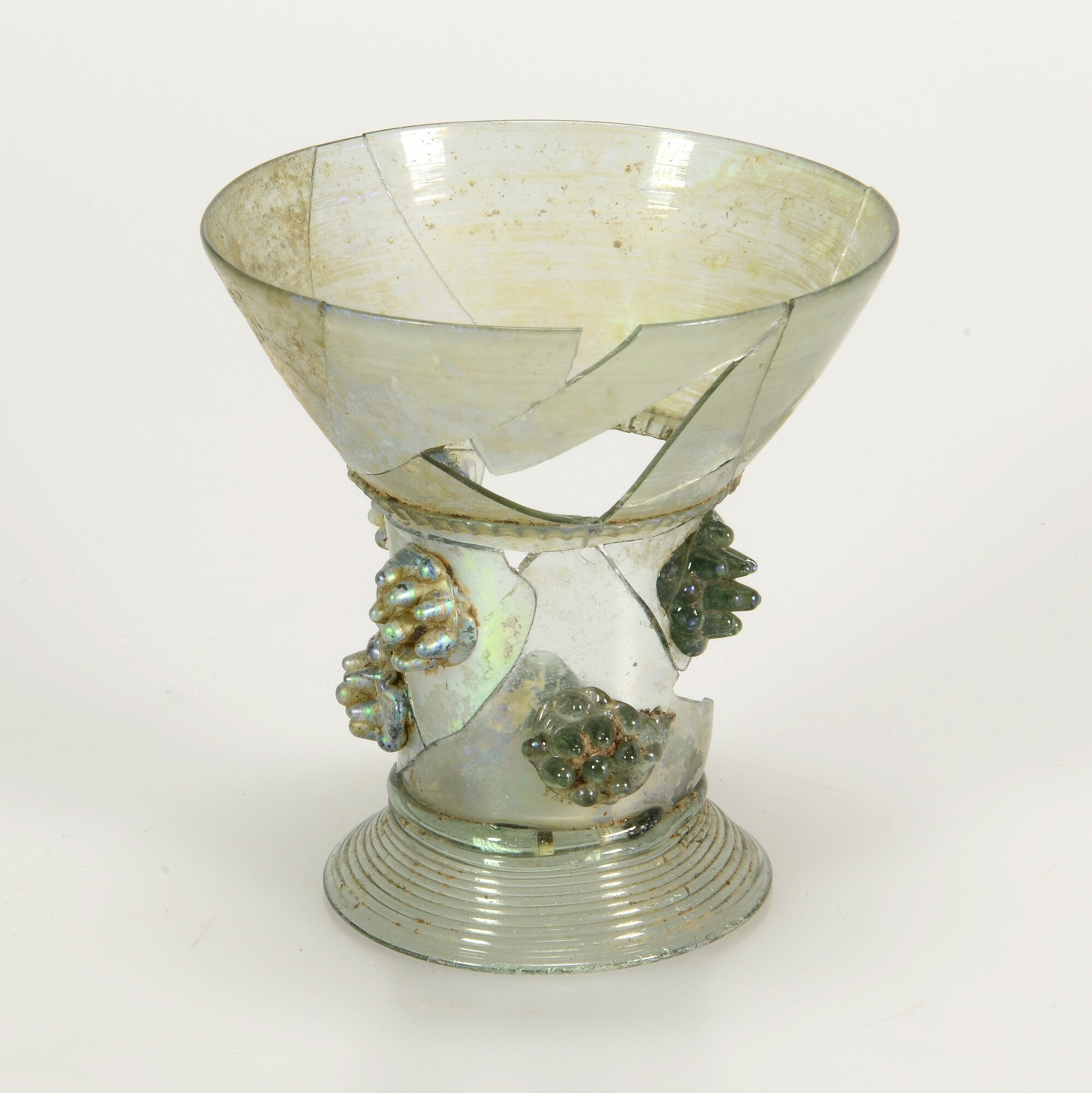 Roemer; gl-roe-13; roemer met conische iets toegebogen cuppa, geribde draad op de overgang naar de schacht en één of meer verspringende rijen braamnoppen, opgestoken bodem met pontilmerk, gewonden draadvoet; lichtgroen glas; herkomst: Duitsland