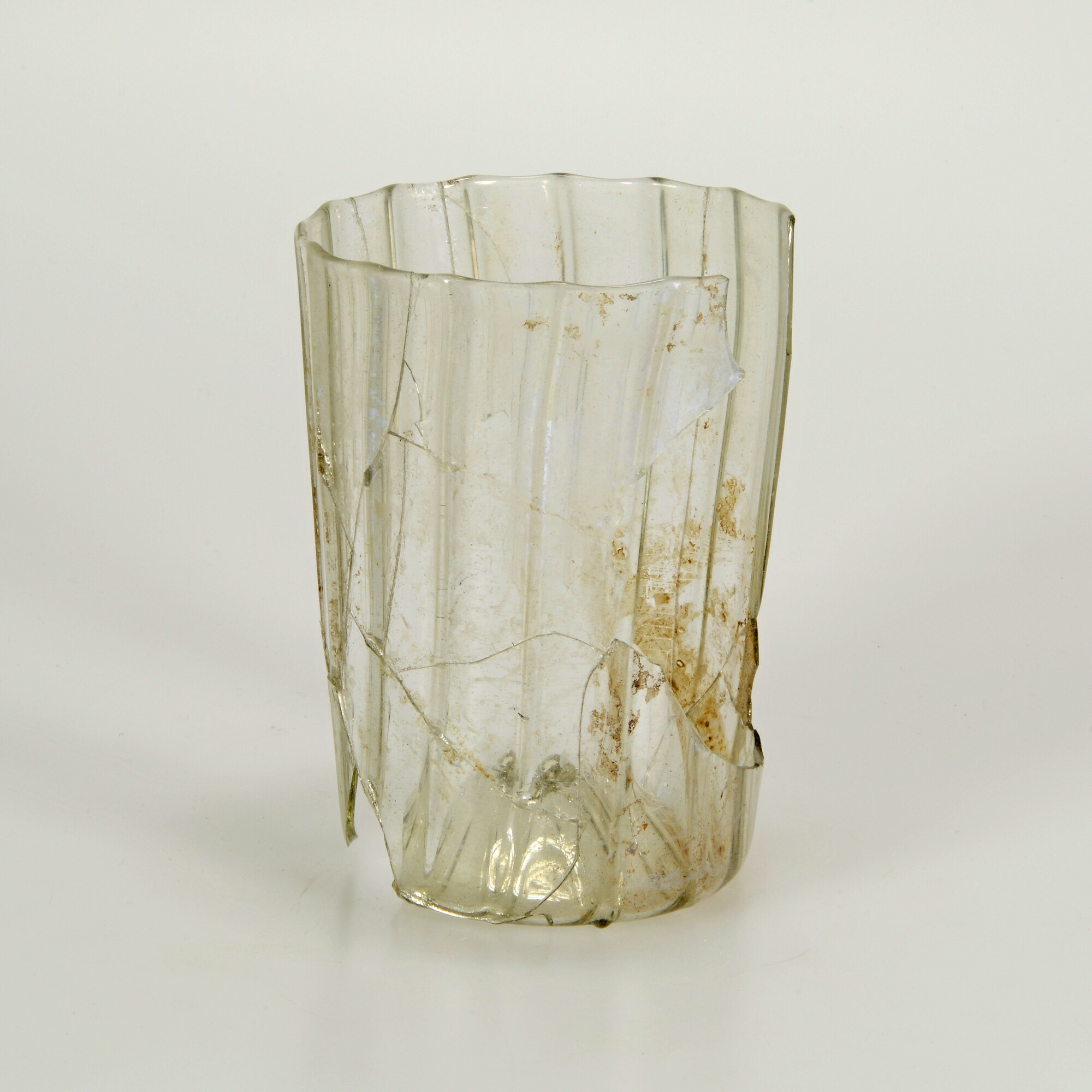 Ribbeker; gl-bek-59; cilindrische beker met verticale ribben, zonder noppootjes, opgestoken bodem met pontilmerk; kleurloos