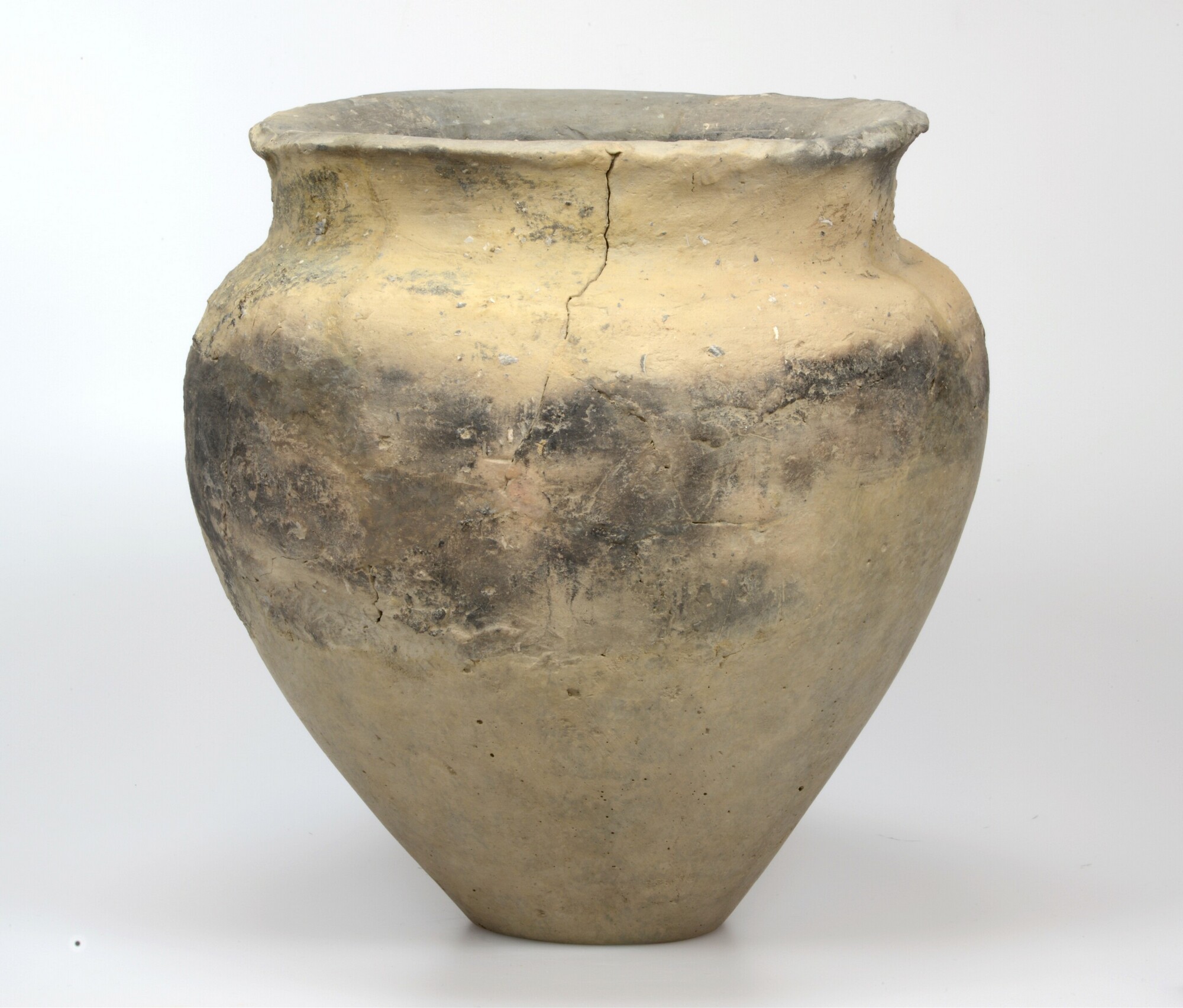 Kookpot; type Diederik O-Ib; inheems-romeins aardewerk; nauwmondige pot met scherpe gefacetteerde rand; standvlak; besmeten; schelpgruis magering