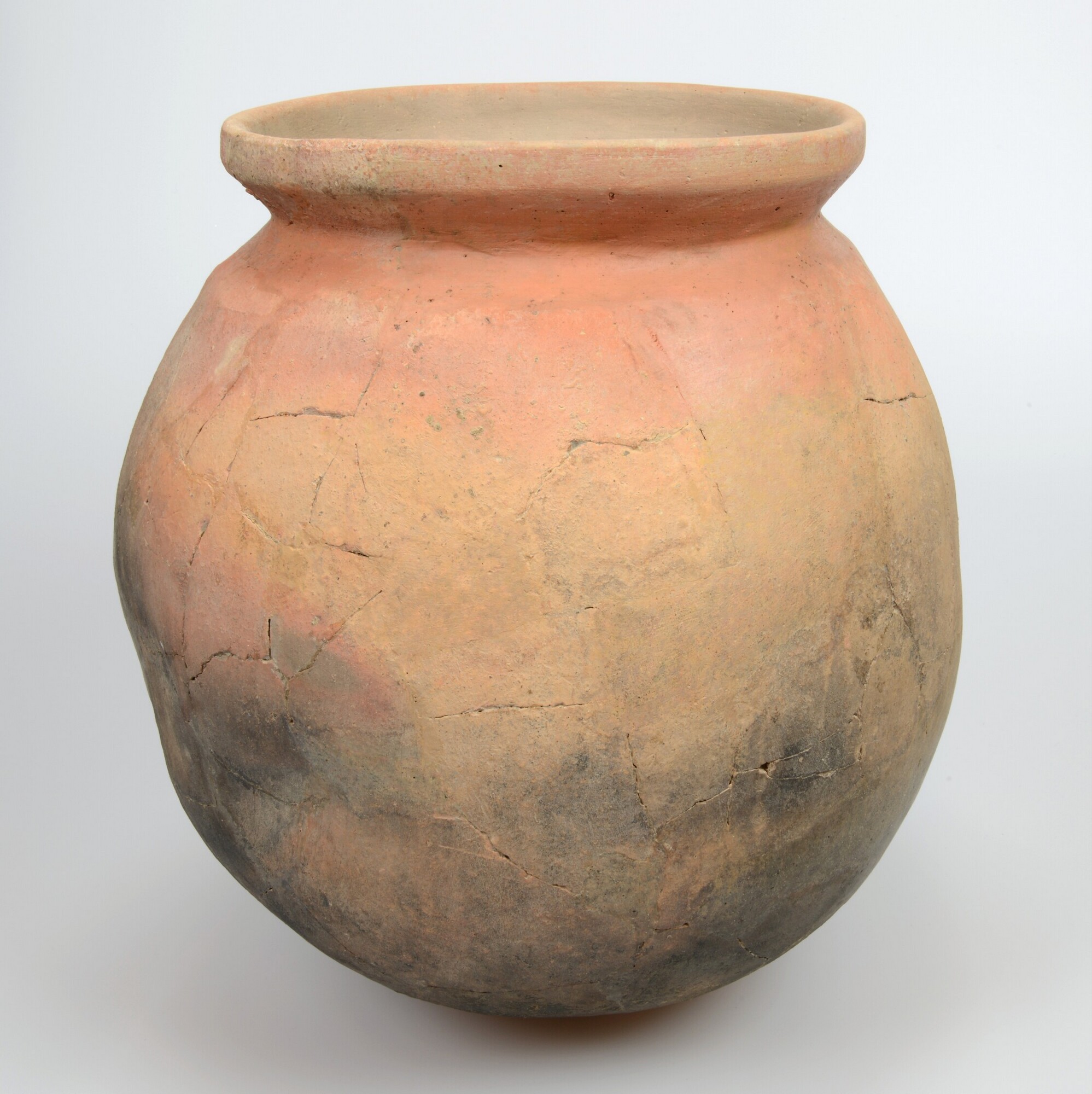 Kogelpot; kp-kog-7; kogelpot met zware kraagrand; kogelpotaardewerk met zandmagering; bodem beroet; herkomst: West- of Noord-Nederland