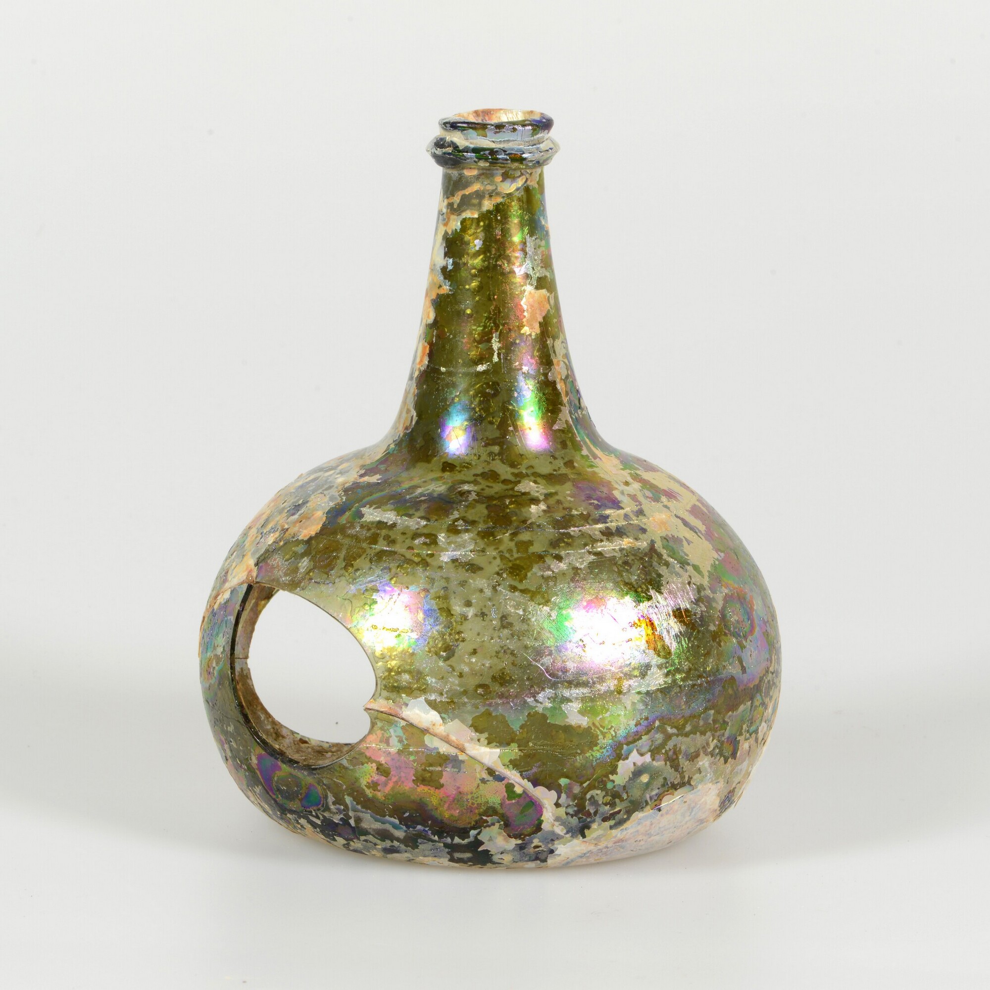 Wijnfles:hoge hals, opgebolde bodem