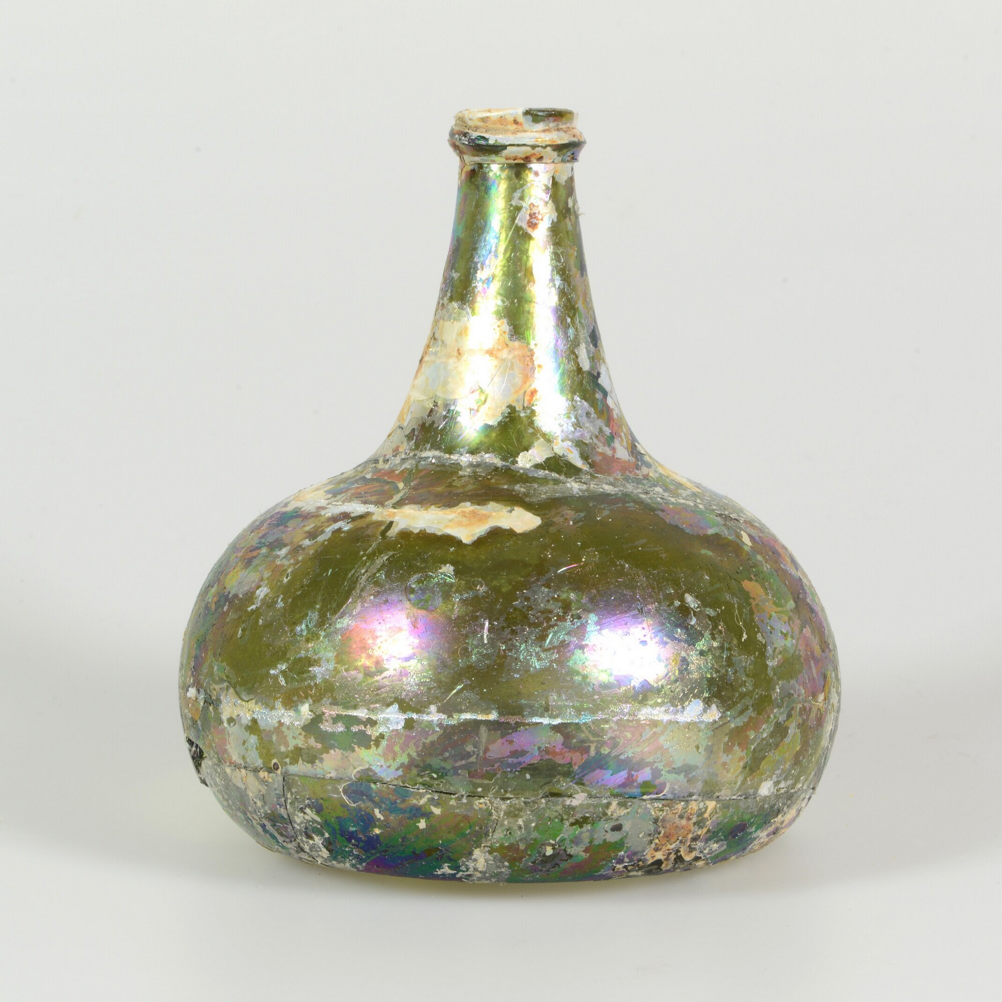 Fles; gl-fle-; groen glas met halsdraad; opgestoken bodem met pontilmerk