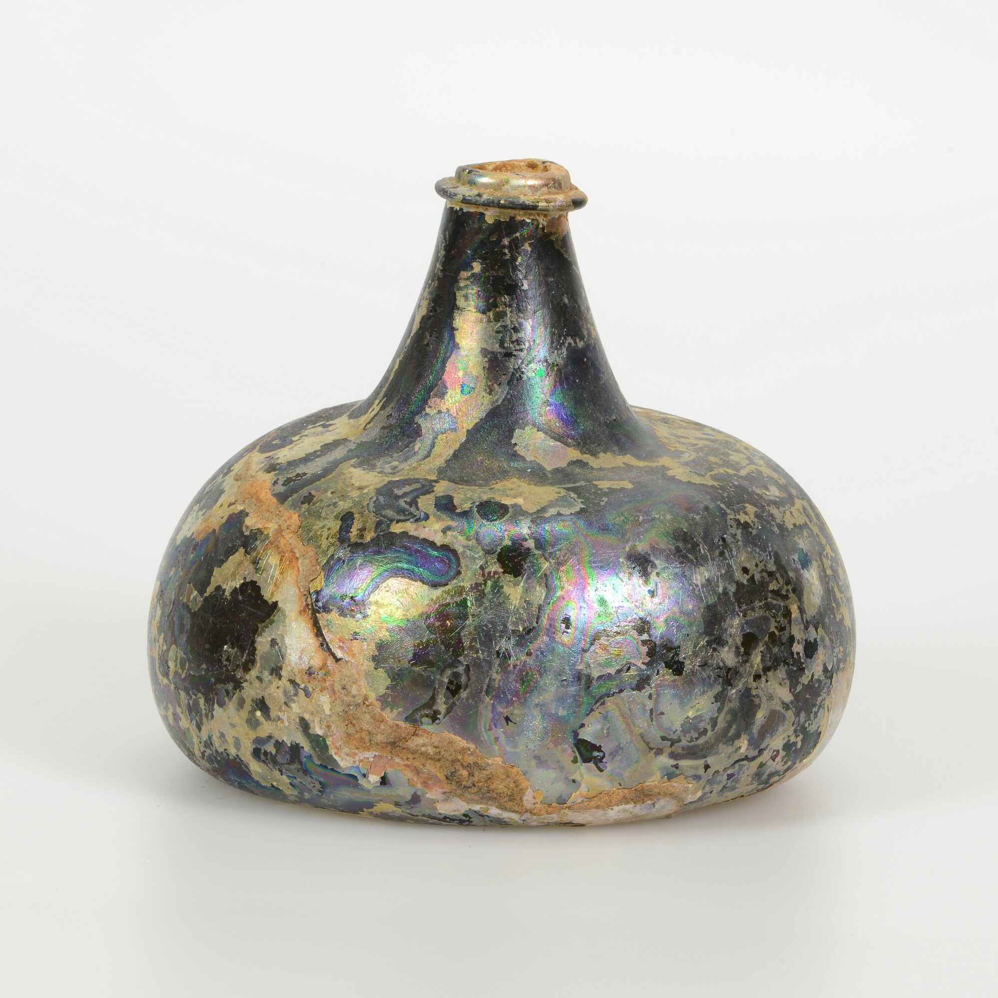 Wijnfles:hoge hals, opgebolde bodem