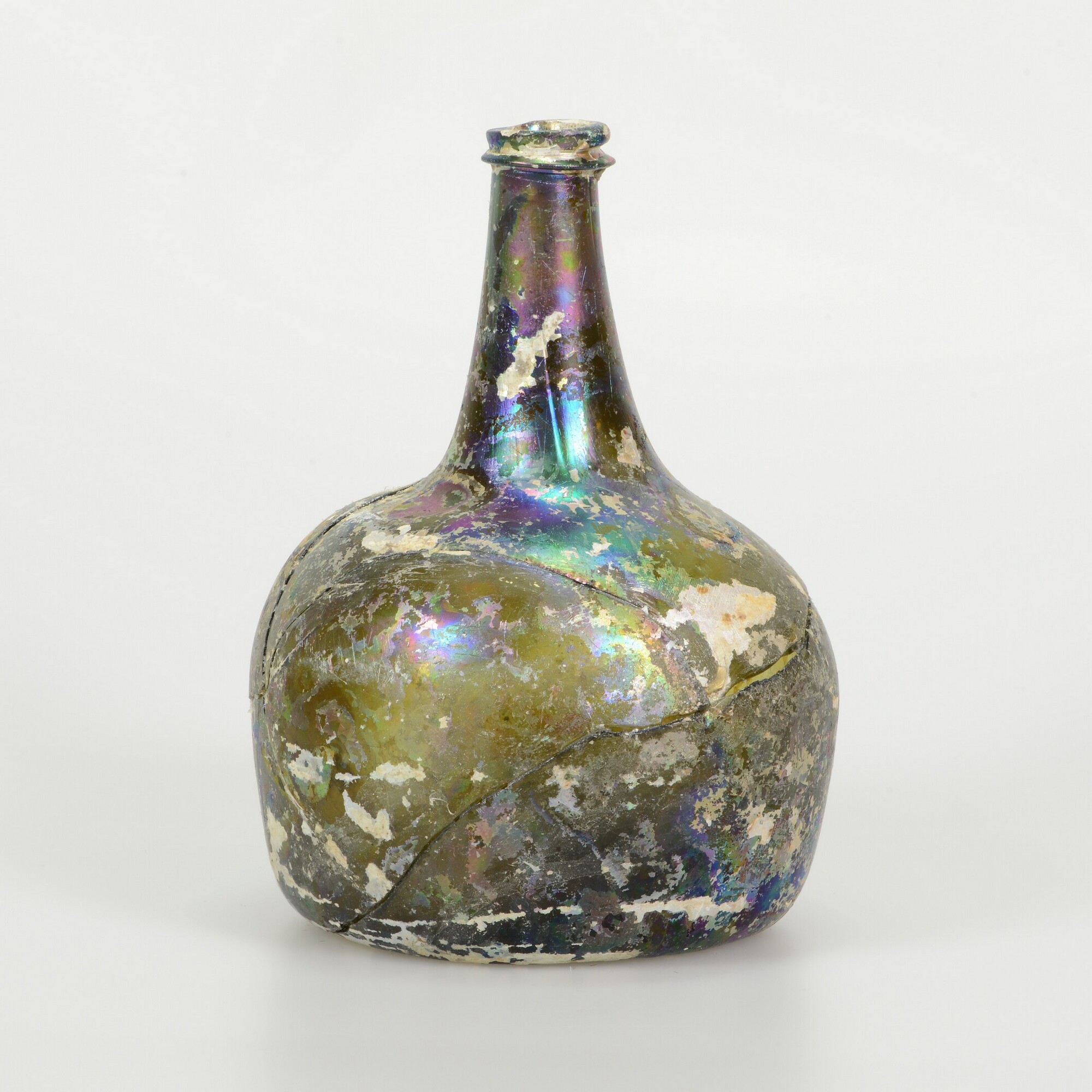 Fles; gl-fle-; groen glas met halsdraad; opgestoken bodem met pontilmerk