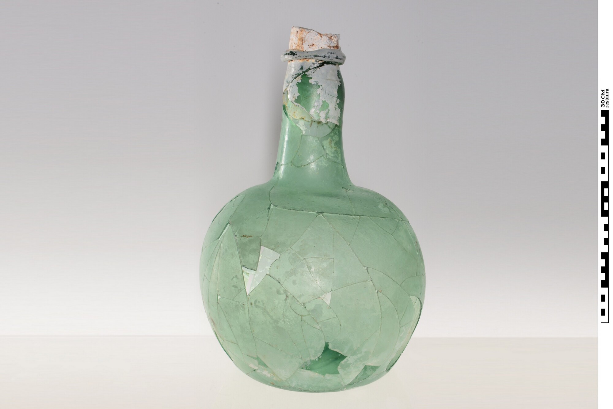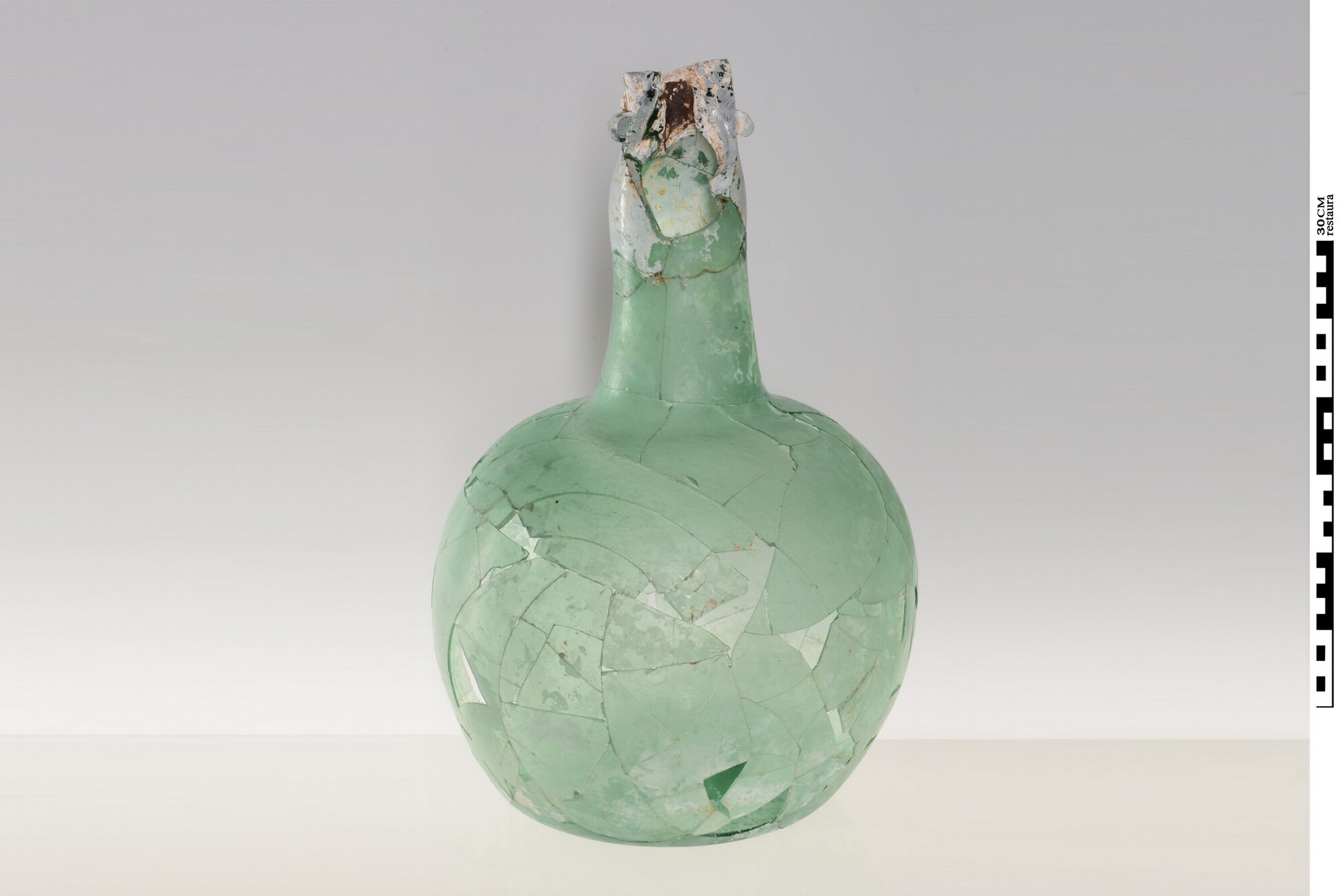 Fles; gl-fl-?; lichtgroen glas; bolle buik, hoge zwaar uigevoerde hals, dikke glasdraad rond hals