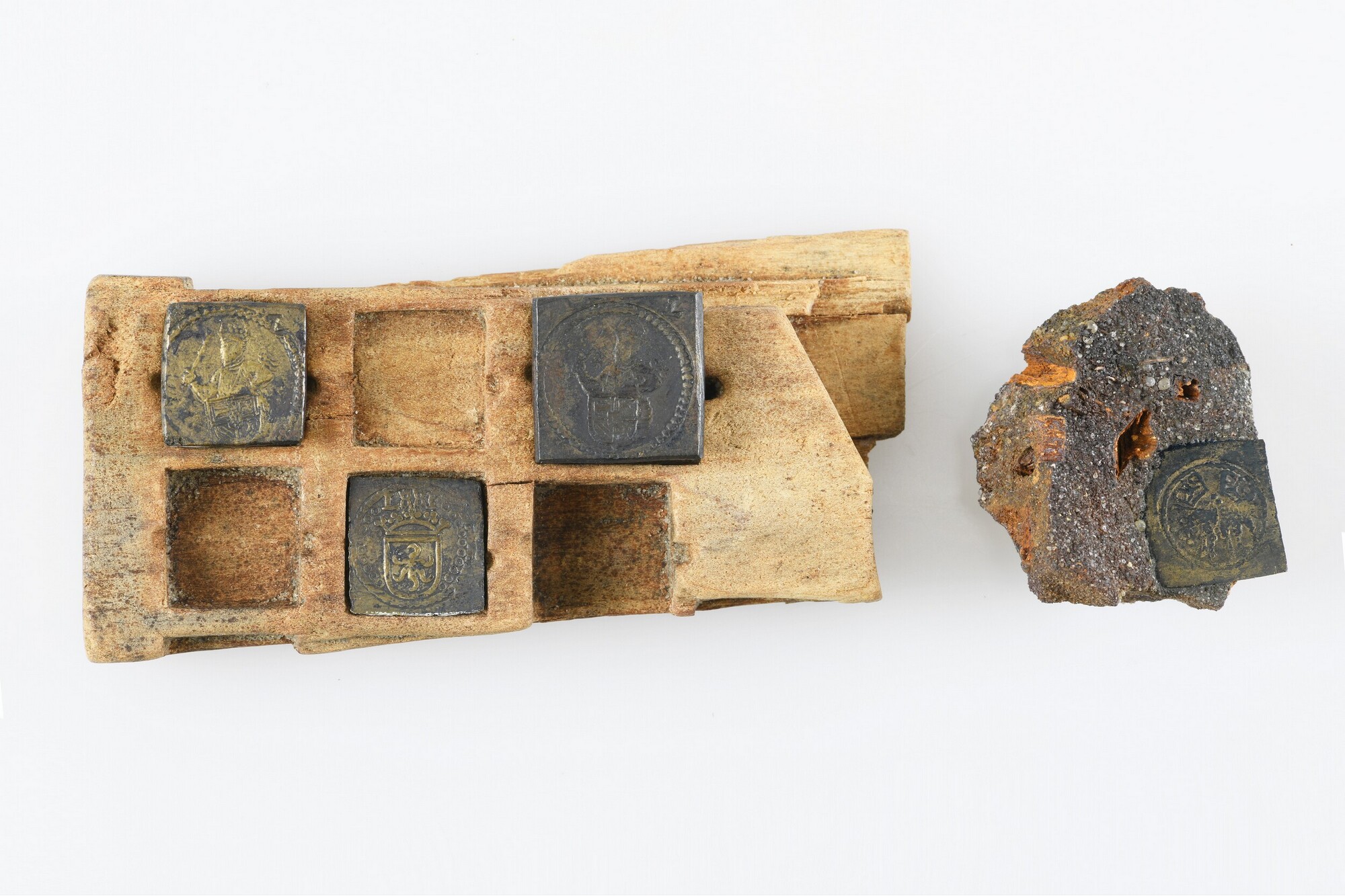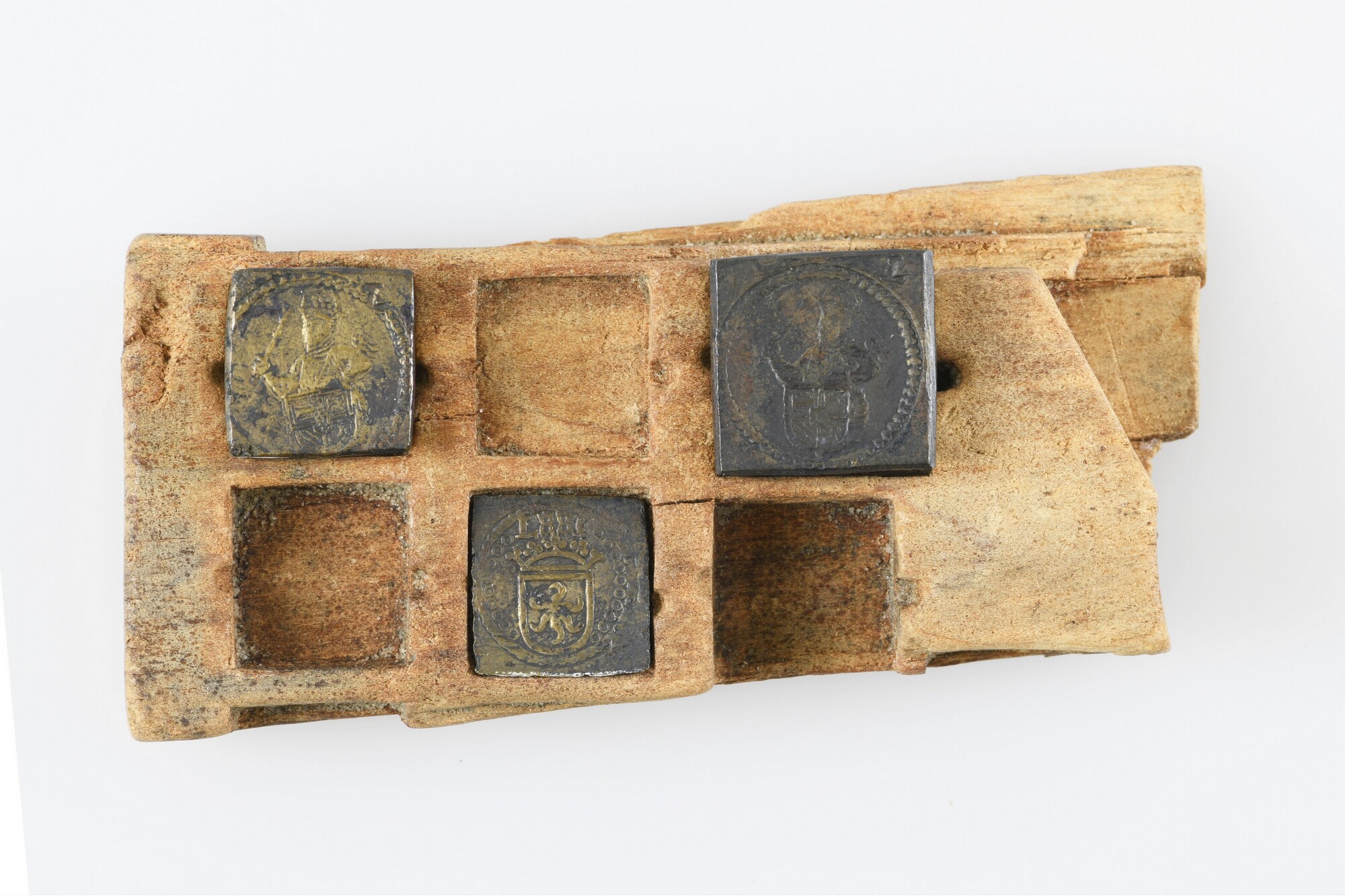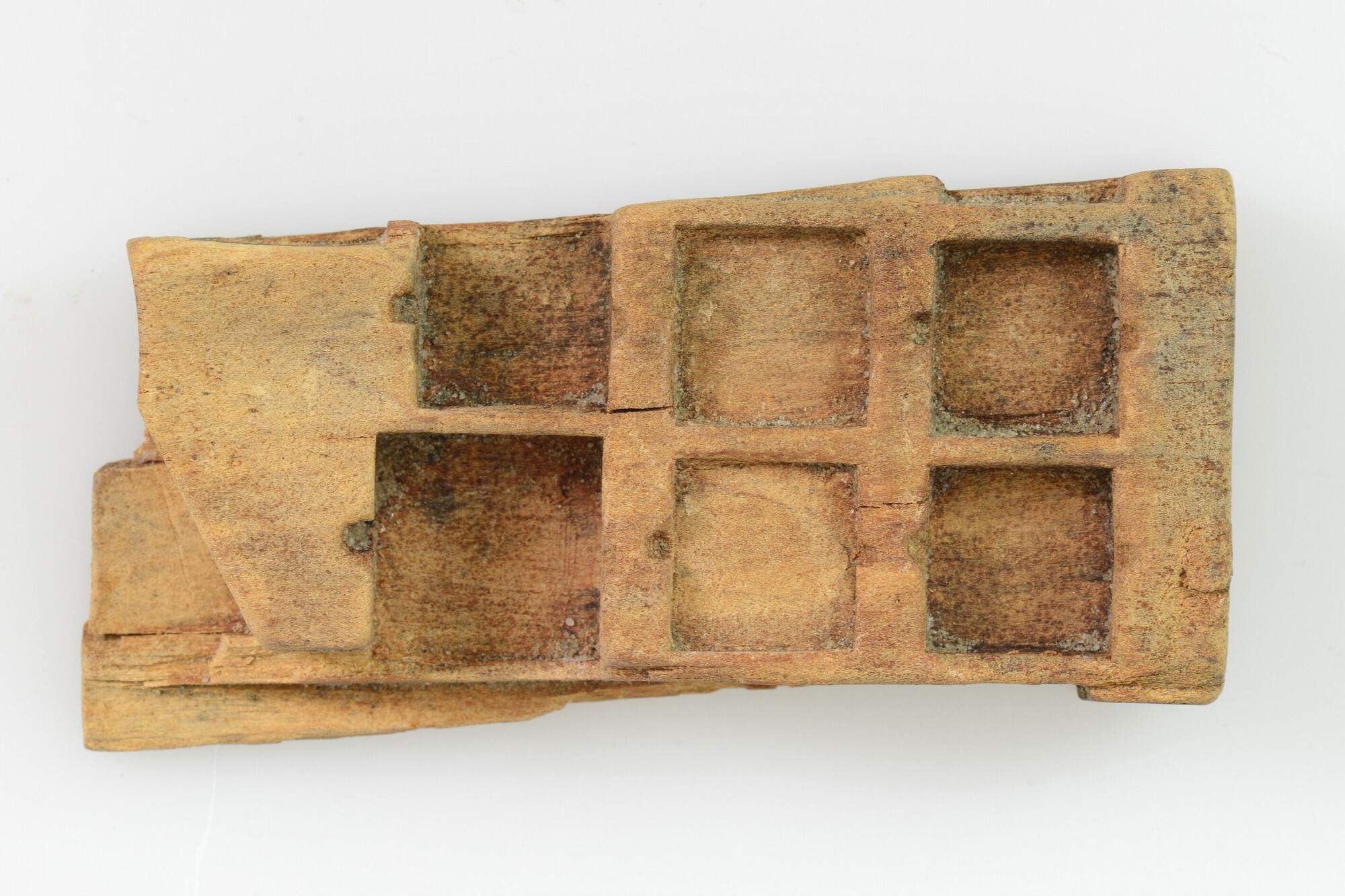 Muntgewichtdoos; fragment met zes vierkante vakken waarin de muntgewichten werden bewaard