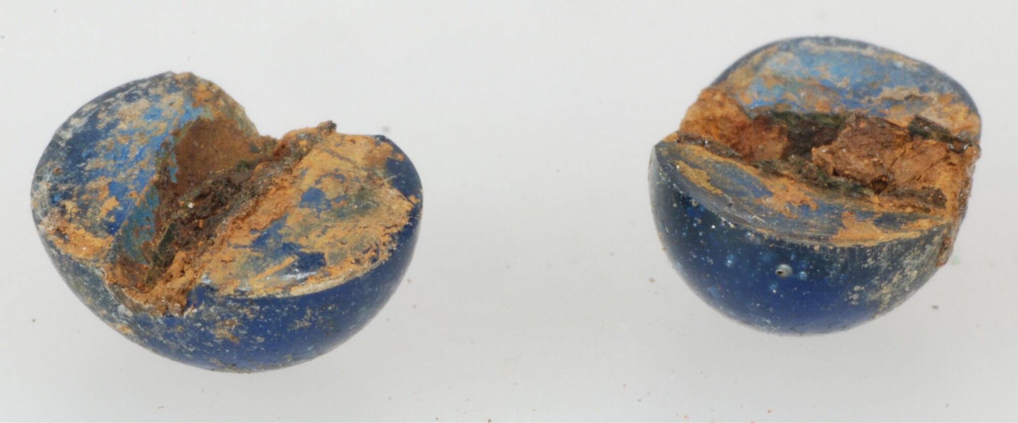 Kraal; blauw glas; twee fragmenten met centrale doorboring