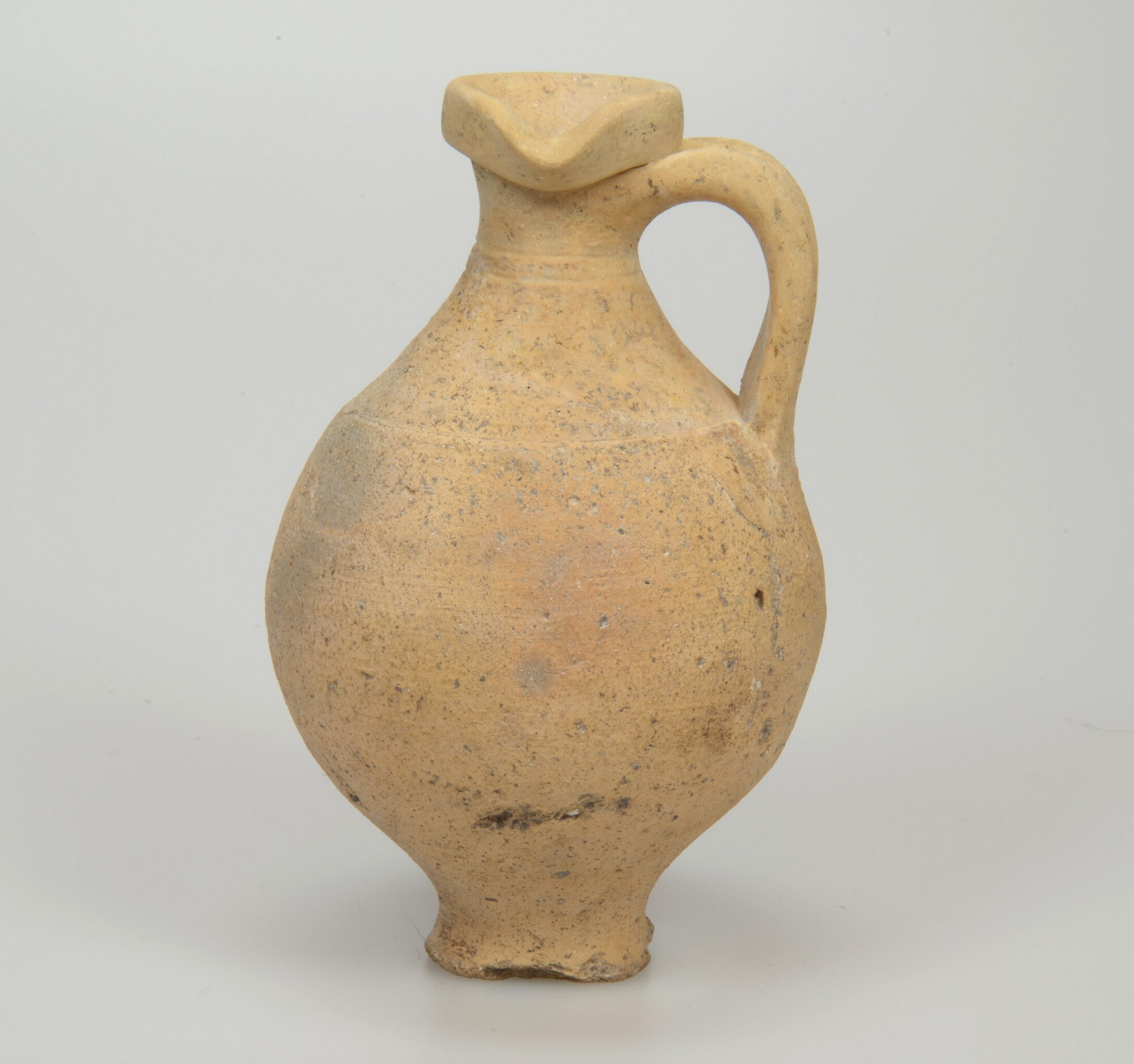 Gladwandige kruik; Type Stuart type 115/Niederbieber type 64; bolvormige kruik met slanke hals en schenktuit; verticaal lintoor; standvoet; fijne kwartsmagering