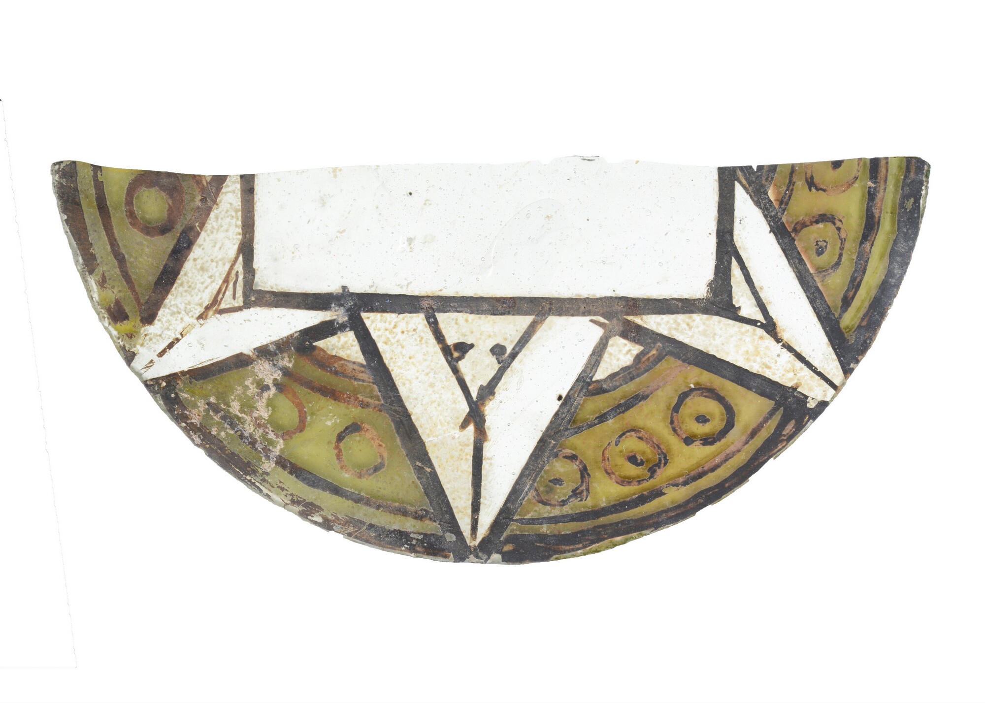 Rondeel/roundel; helft van lichtgroen doorzichtig glas; beschilderd met donkerbruine/zwarte verf; in het midden een leeg vierkant; langs de rand driehoeken met lijnen en puntcirkelversieringen erbinnen; tussen het vierkant en de driehoeken zijn Y-vormige lijnen aangebracht