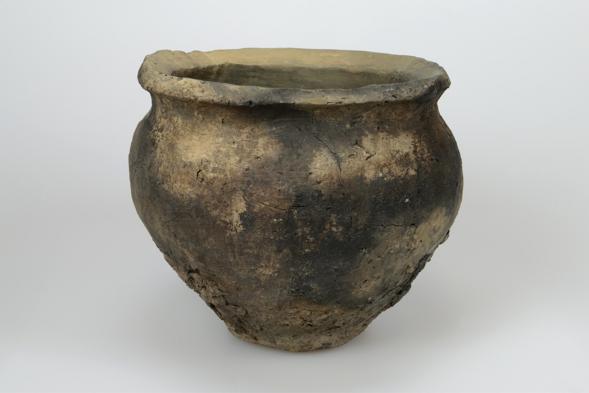 Kookpot (nr. 79-10); type Diederik F-I; inheems-romeins aardewerk; nauwmondige kookpot met versierde kartelrand/A-rand en bolvormig potlichaam; standvlak; besmeten