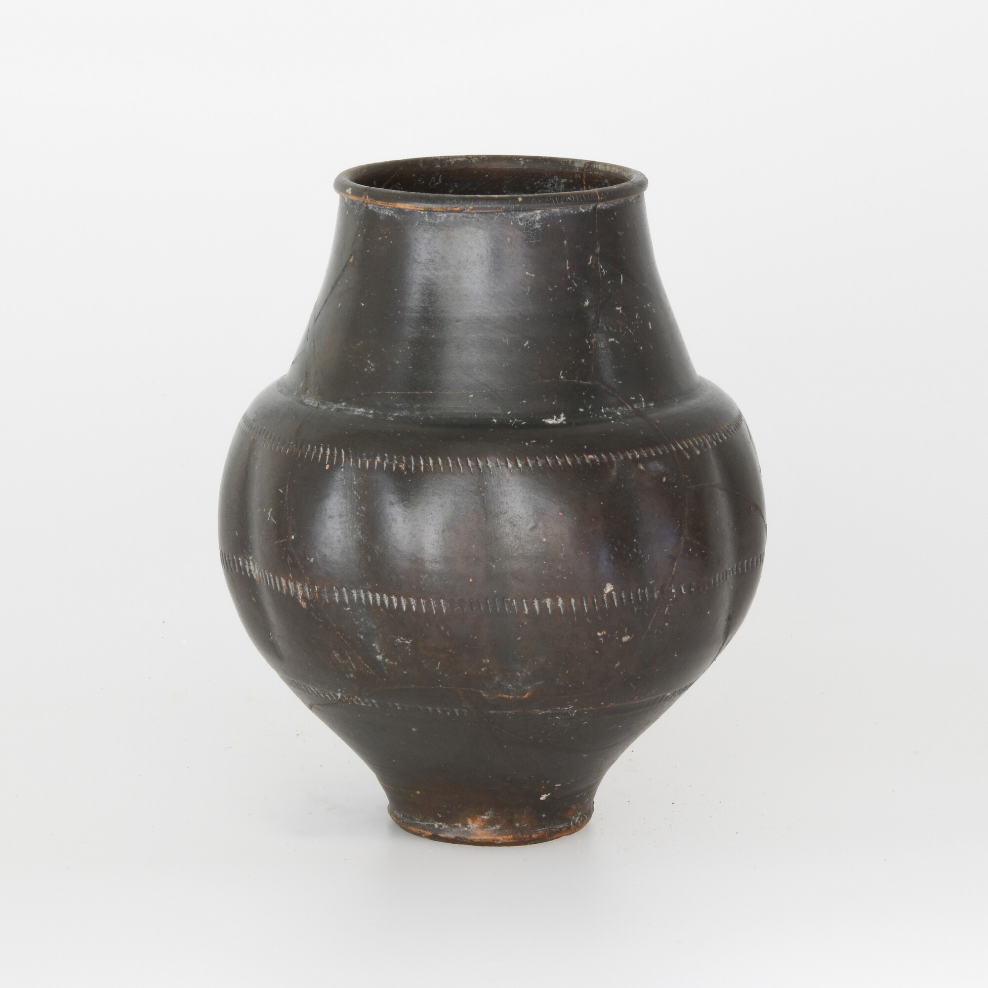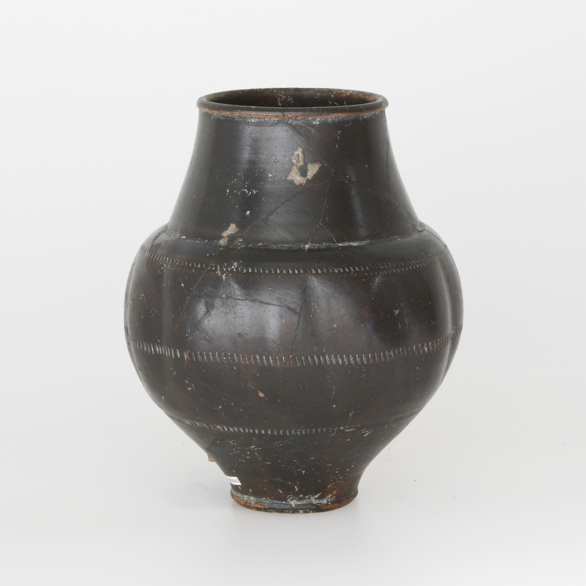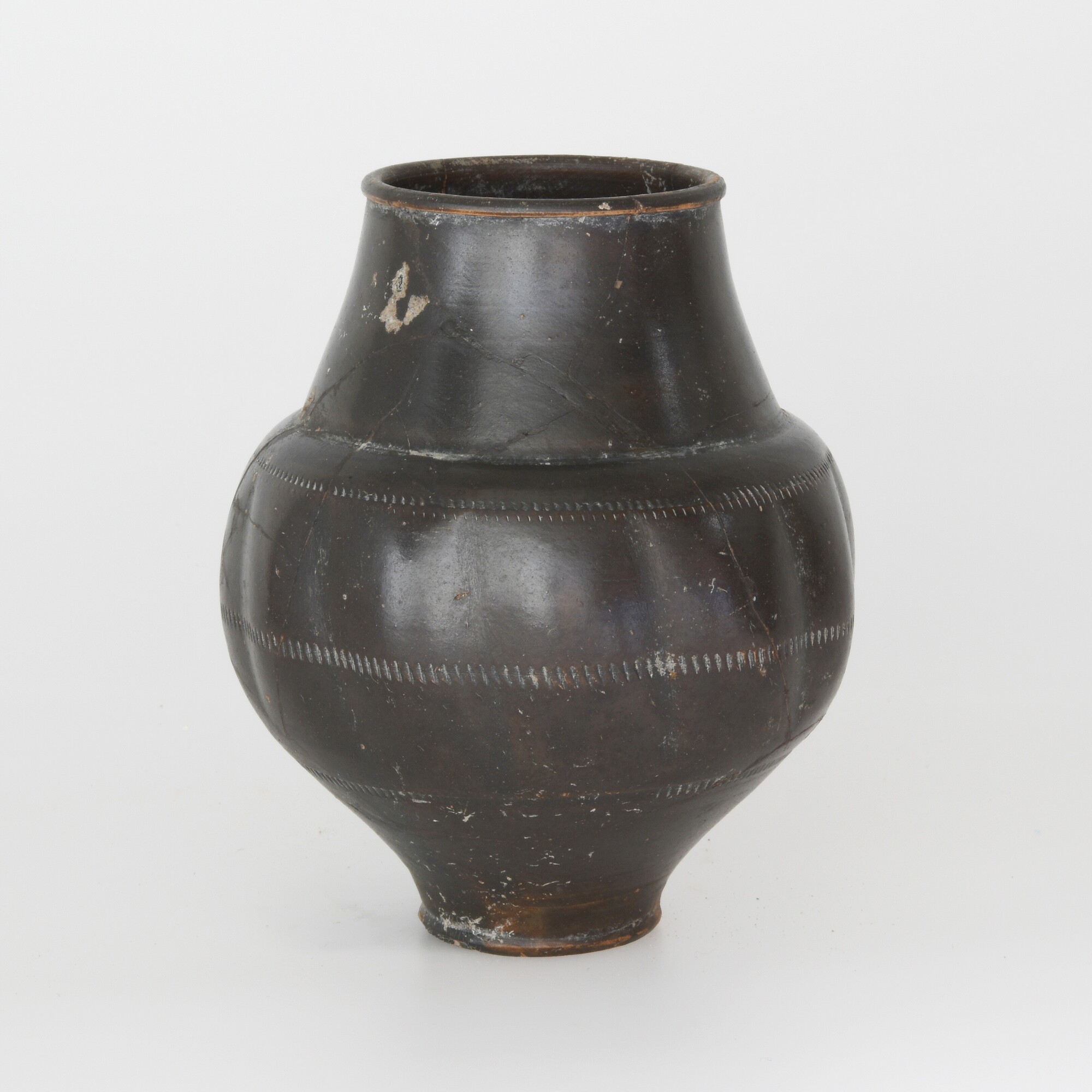 Deukbeker; type Oelmann 33; geverfd aardewerk, techniek D (metaalglanswaar, Qualitätsware); Romeins import, dunwandig rood aardewerk met een sterk glanzende zwarte deklaag, gedeukt, radstempelversiering; productieplaats: Trier of mogelijk Heddernheim