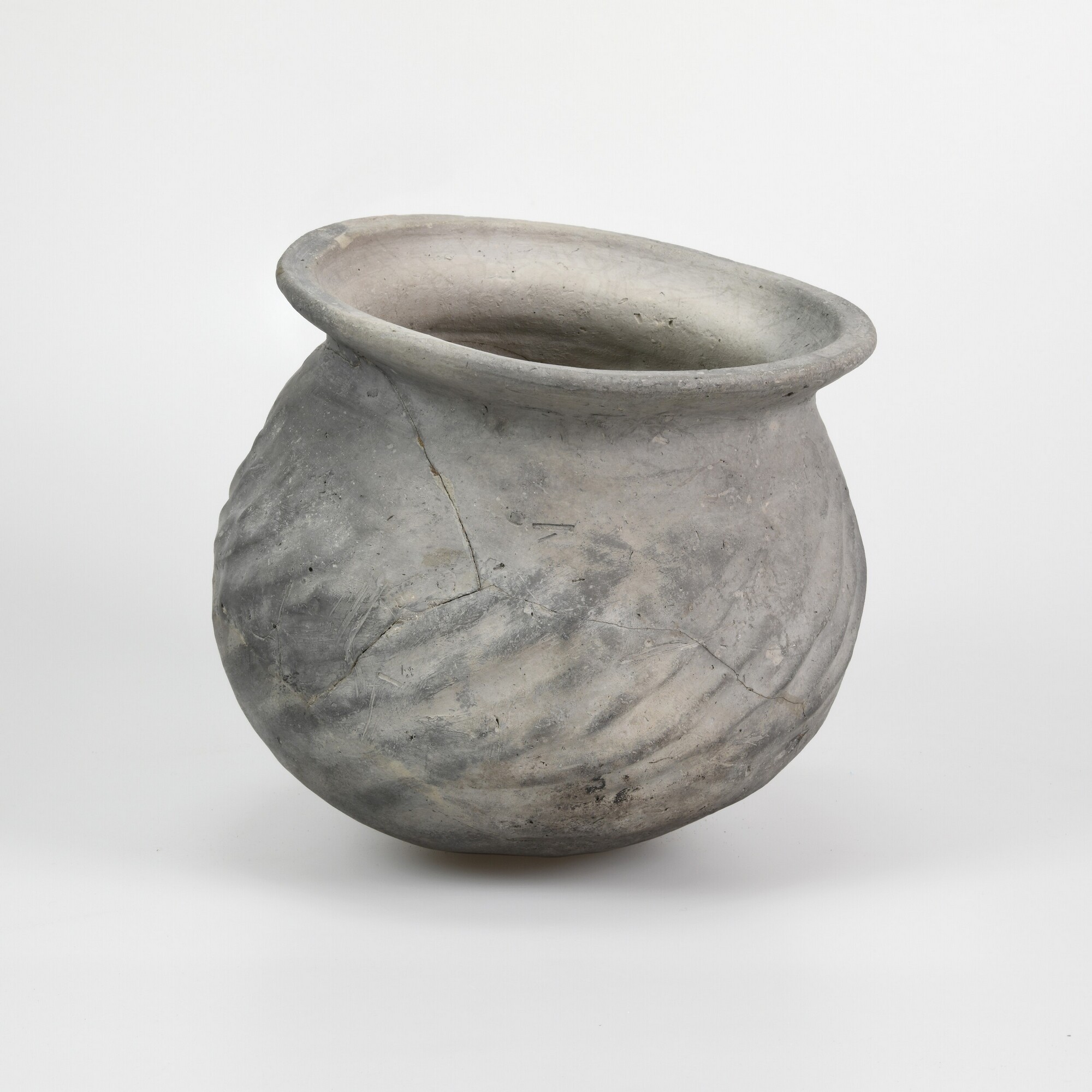 Kogelpot; kp-kog-; geprofileerde rand met dekselgeul en vingerstreepversiering