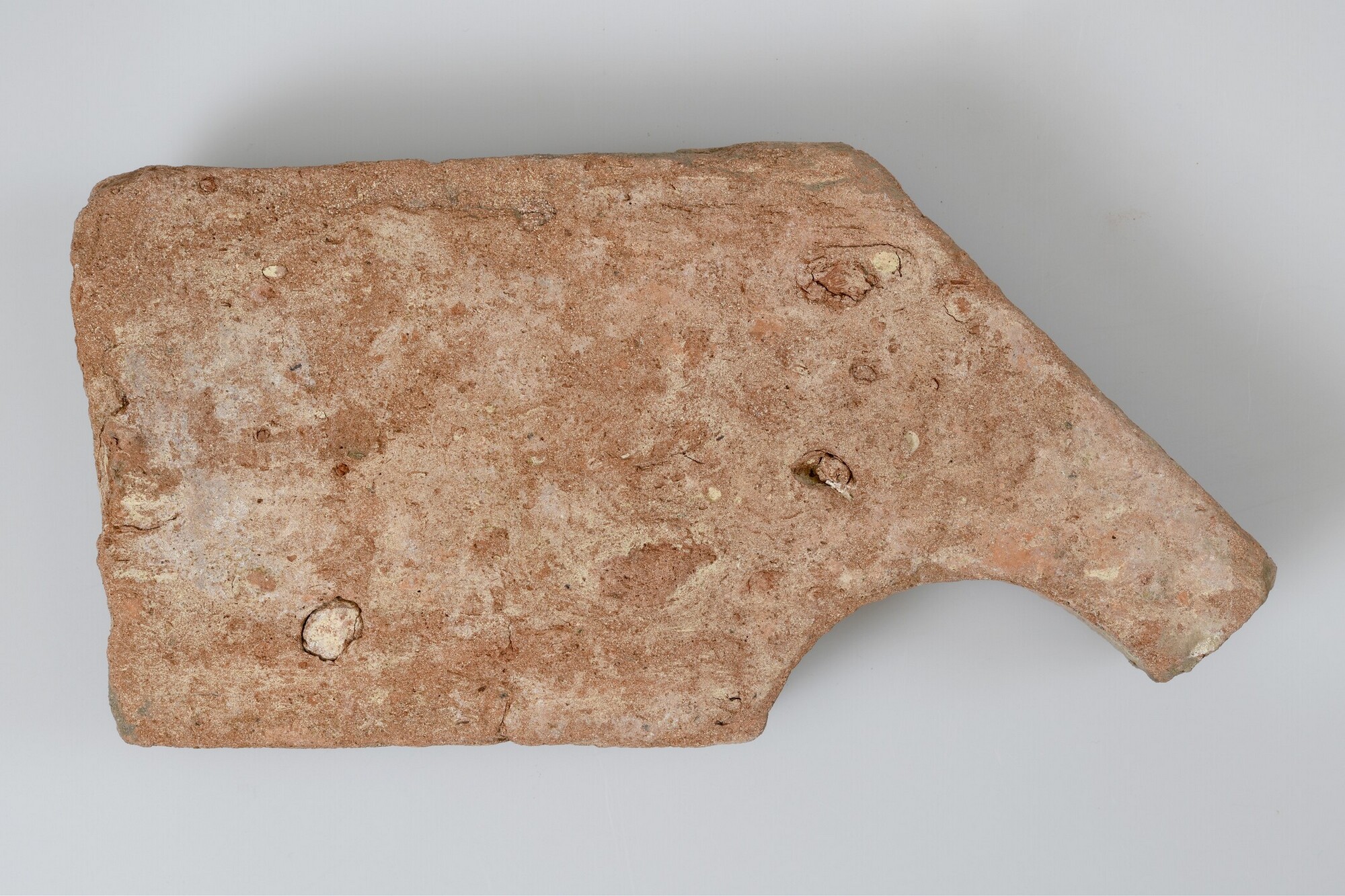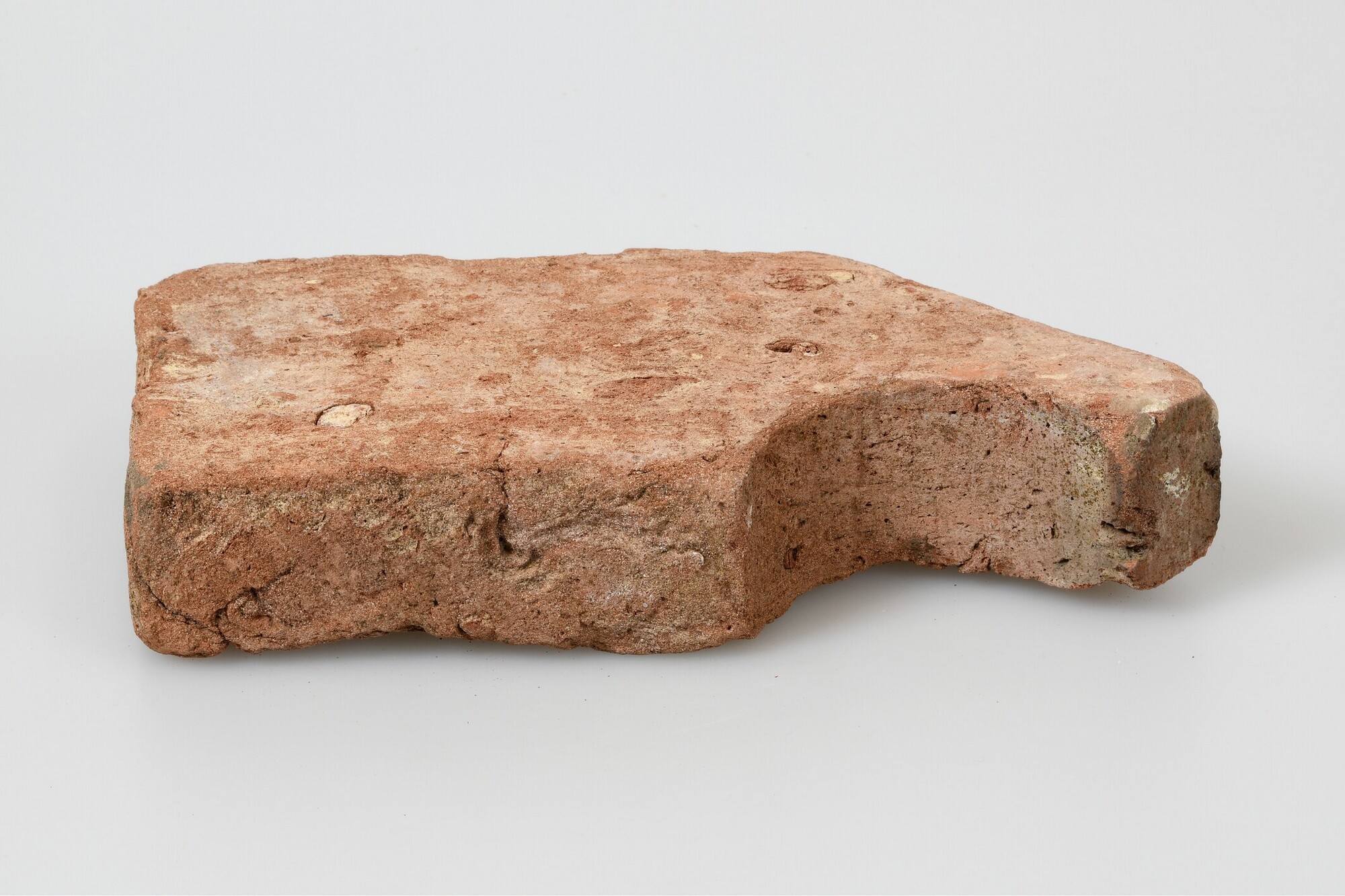 Baksteen van druiplijst; baksteen; roodbakkend; halve cirkel aan onderste strek uitgesneden en bovenste strek diagonaal afgesneden