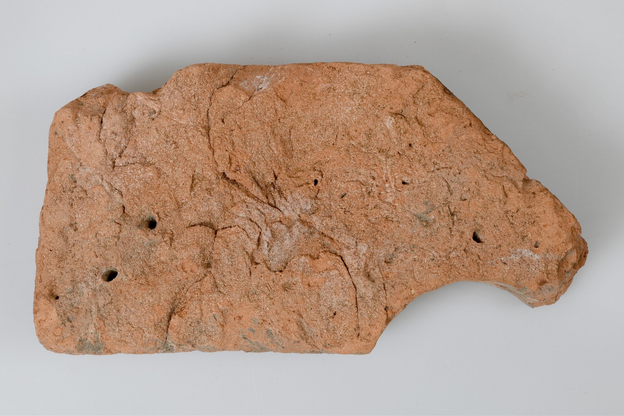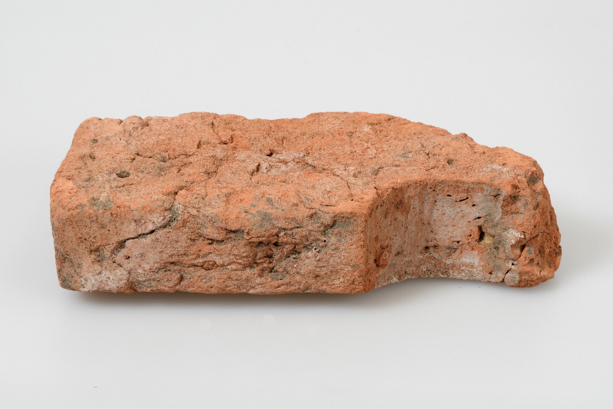 Baksteen van druiplijst; baksteen; roodbakkend; halve cirkel aan onderste strek uitgesneden en bovenste strek diagonaal afgesneden; aan de andere zijde is eerder een begin gemaakt van een uitgesneden halve cirkel en diagonaal getrokken lijn
