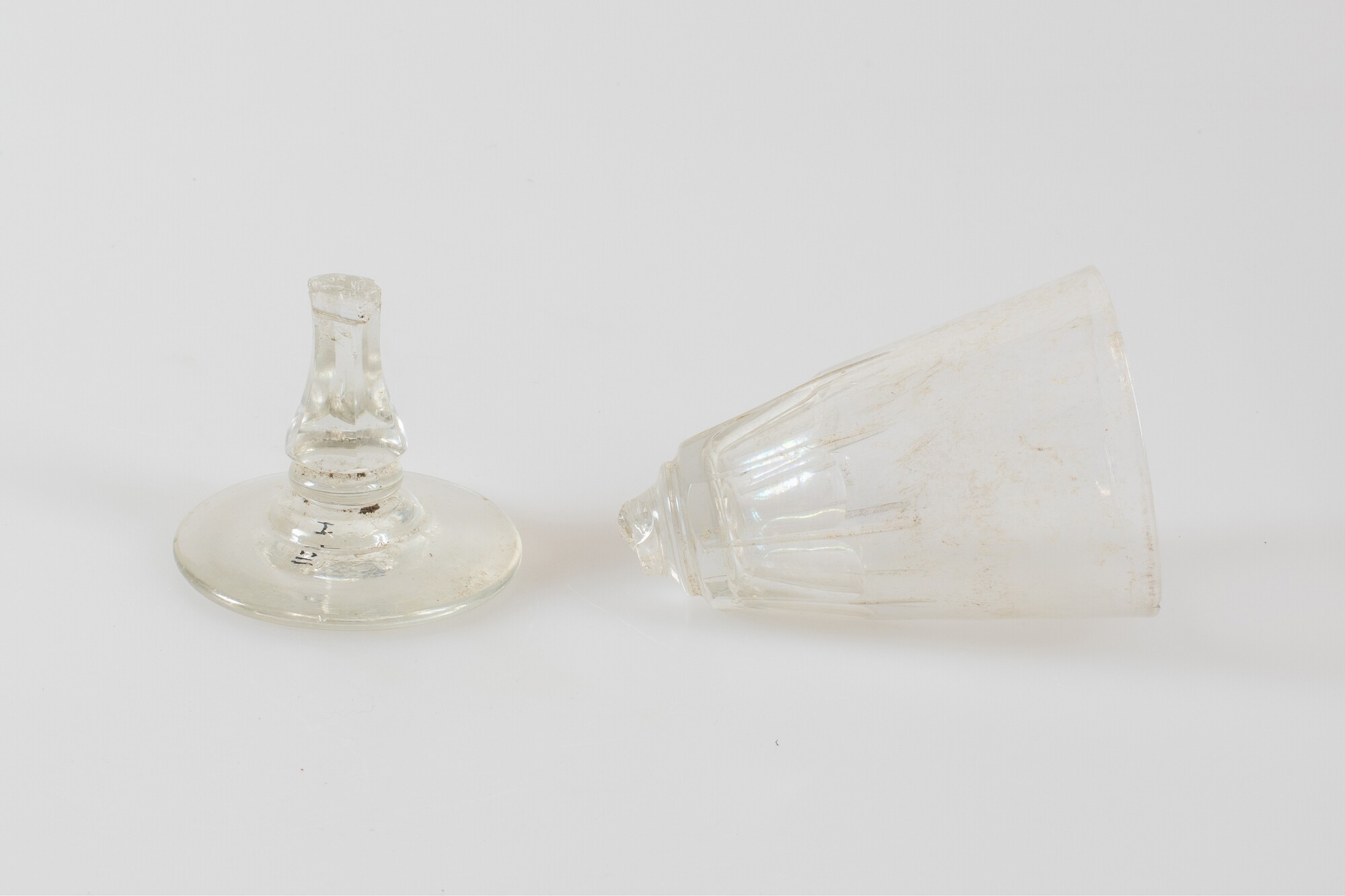 Kelkglas; gl-kel-NT; kleurloos glas; conische kelk met geslepen facetten; balustervormige stam