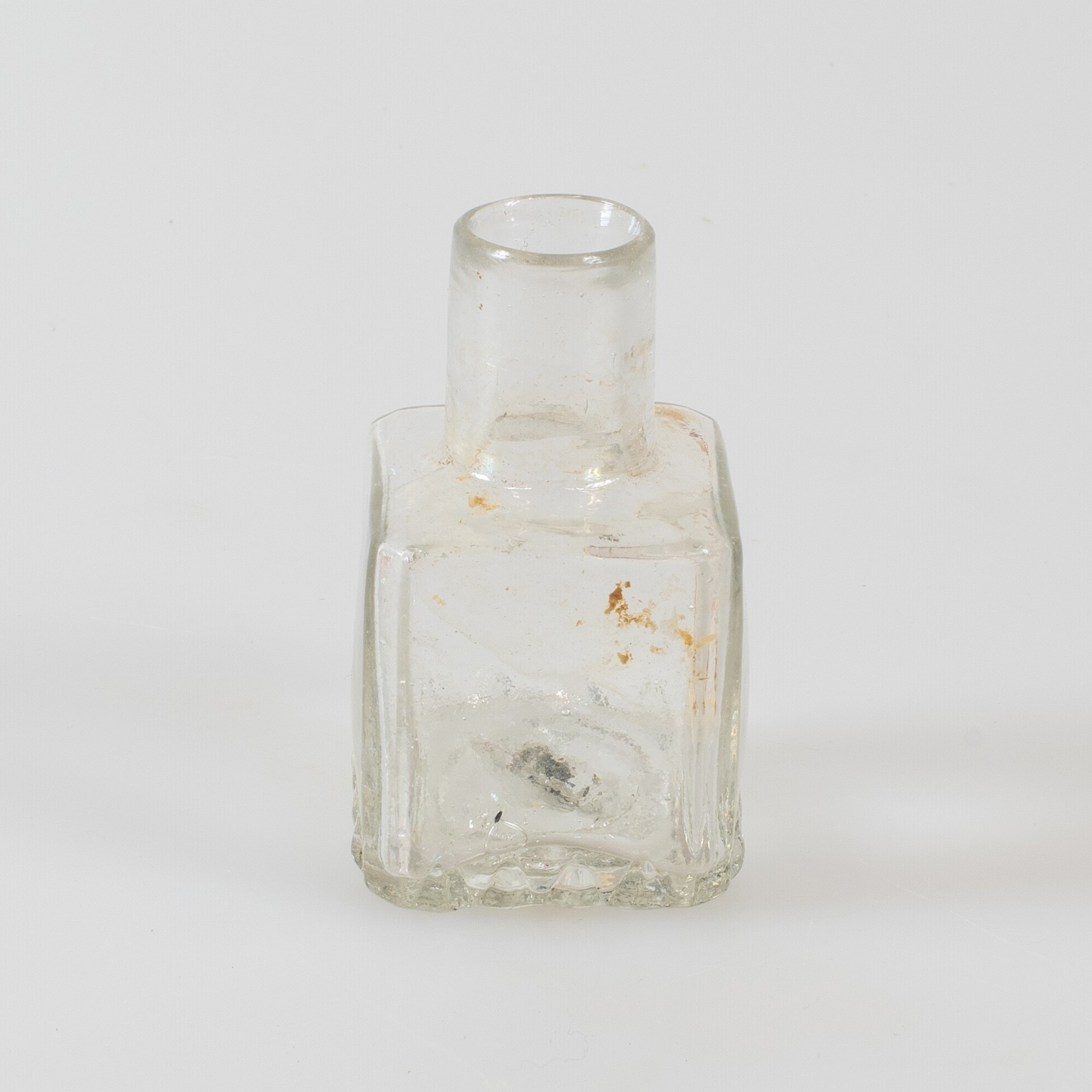 Inktpot; gl-fle-NT; vierkante fles met hoge, cilindrische hals; kleurloos glas; malgeblazen; de bodem is versierd met vier driehoekjes in reliëf aan elke zijde; pontilmerk