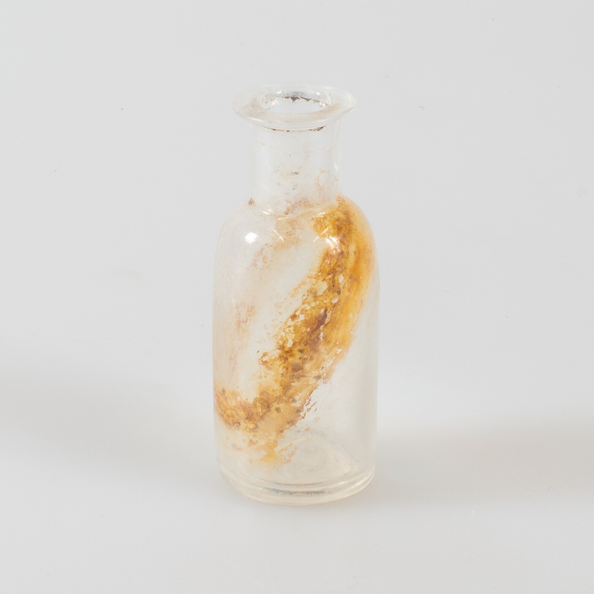 Medicijnfles; gl-fle-14a; kleine cilindrische fles met afgeronde schouder met korte hals en uitstaande lip, met smalle hals, standring; kleurloos glas; "15" [ml] in reliëf op de bodem