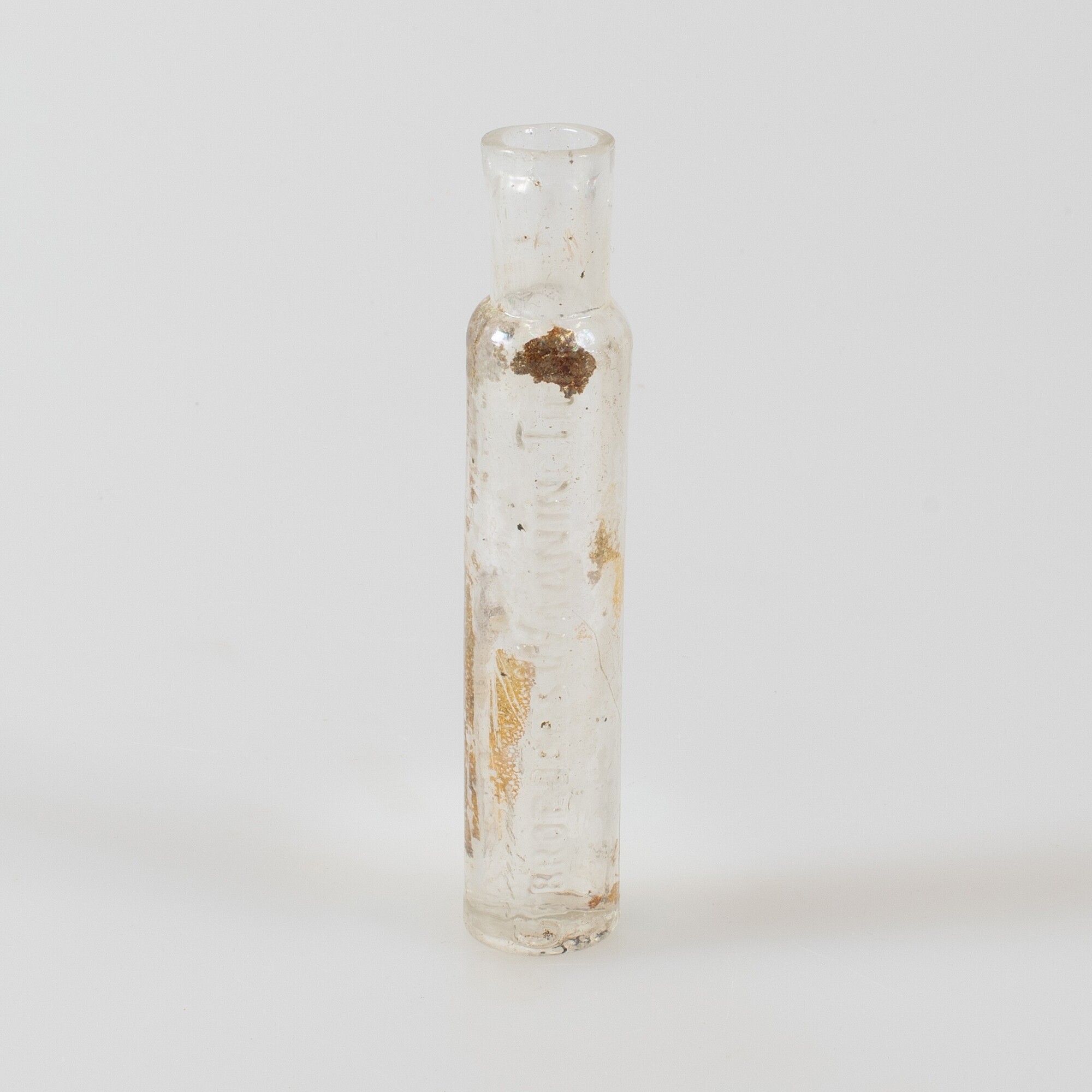 Medicijnfles, Haarlemmerolieflesje; gl-fle-50; kleine cilindrische fles met korte cilindrische hals, contactvorm met twee verticale naden, standvlak; kleurloos glas; reliëftekst: "Gebroeders Waaning Tilly"