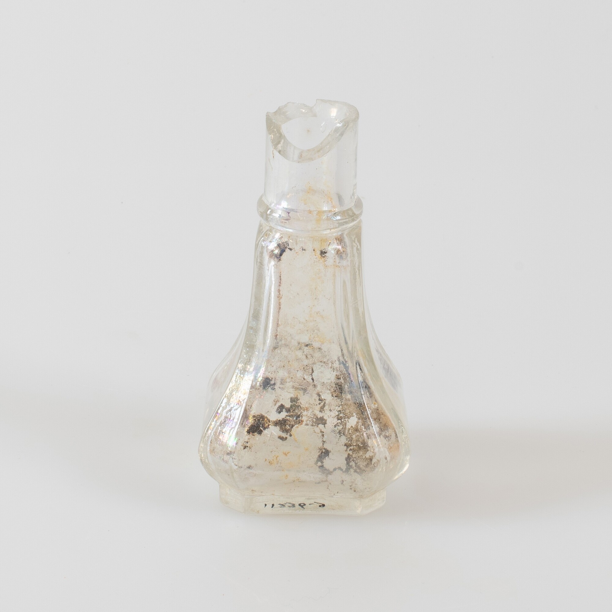 Lijmfles; gl-fle-; malgeblazen vierhoekig en peervormig flesje; standvlak; kleurloos glas; hoogstwaarschijnlijk van H. van Gimborn