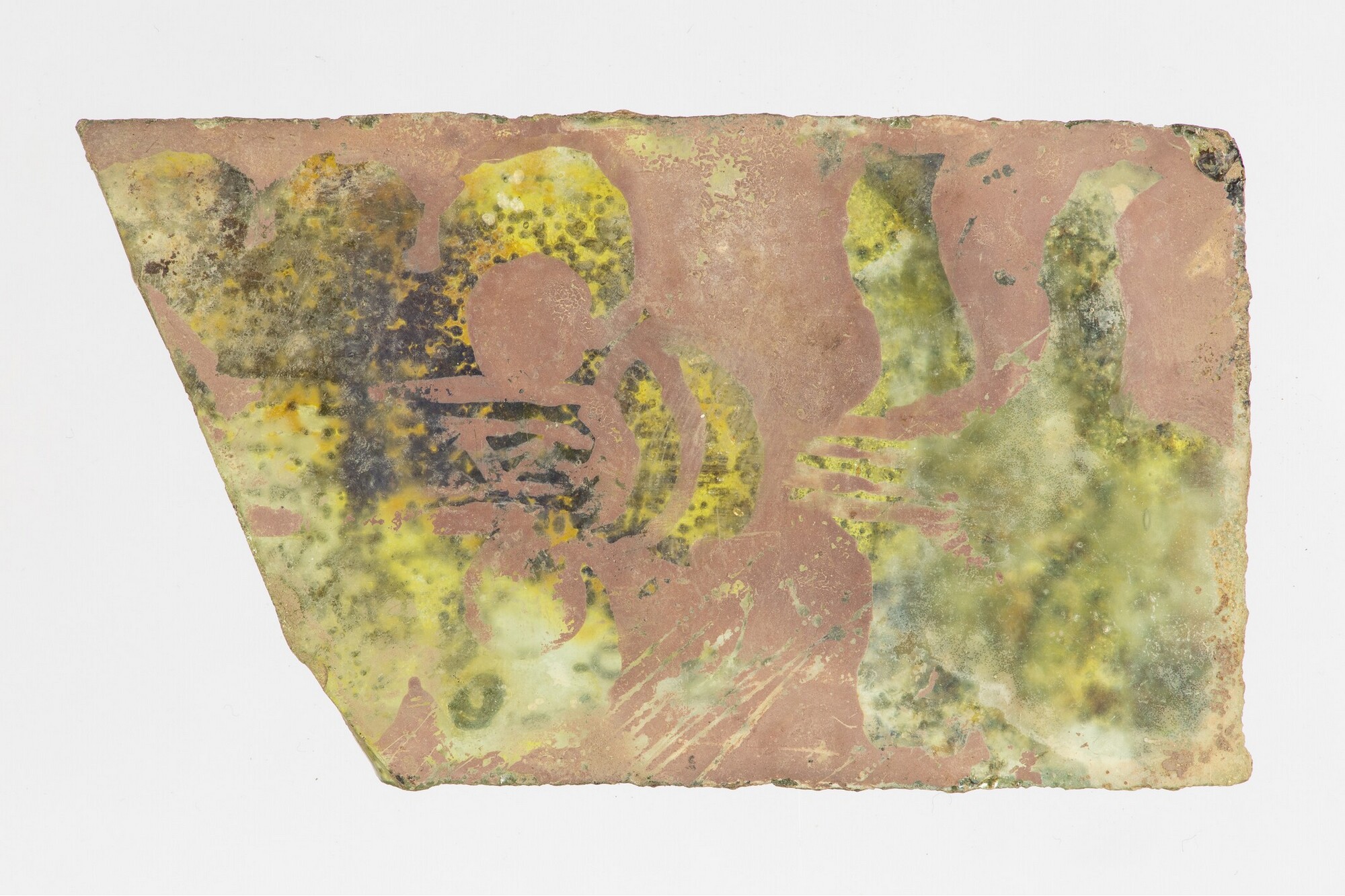 Vensterglas; rechthoek; lichtgroen; gebrandschilderd glas: floraal motief met gele bloem