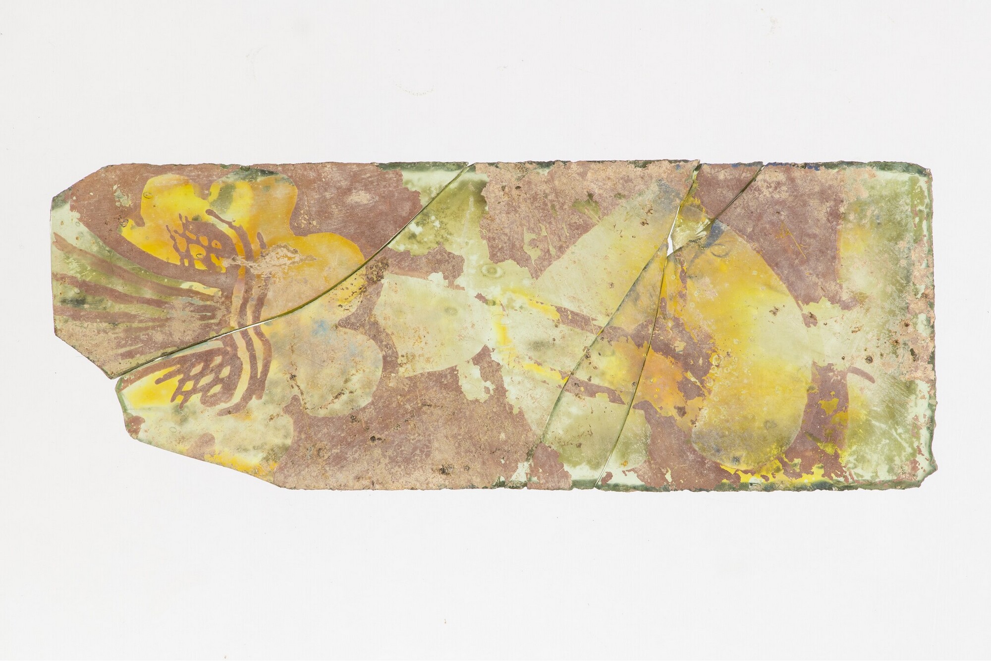 Vensterglas; rechthoek; lichtgroen; gebrandschilderd glas: floraal motief met gele bloem