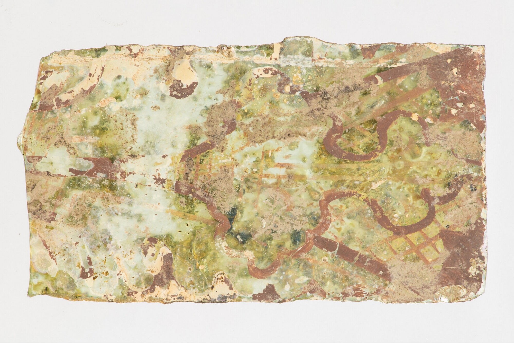 Vensterglas; rechthoek; lichtgroen; gebrandschilderd glas: floraal motief