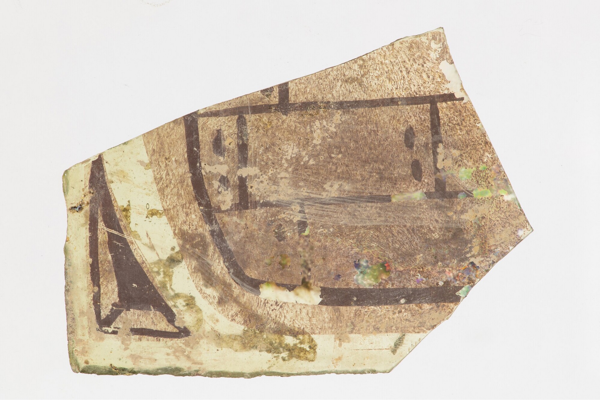 Vensterglas; lichtgroen; gebrandschilderd glas: schild/houten planken?