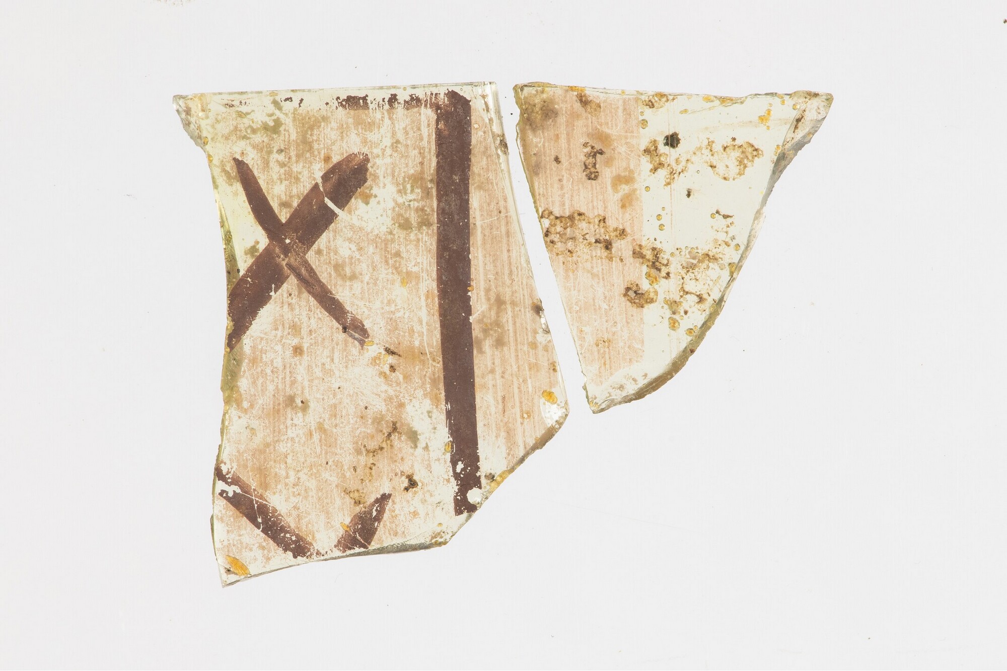 Vensterglas; lichtgroen; gebrandschilderd glas: twee kruisjes naast een verticale streep