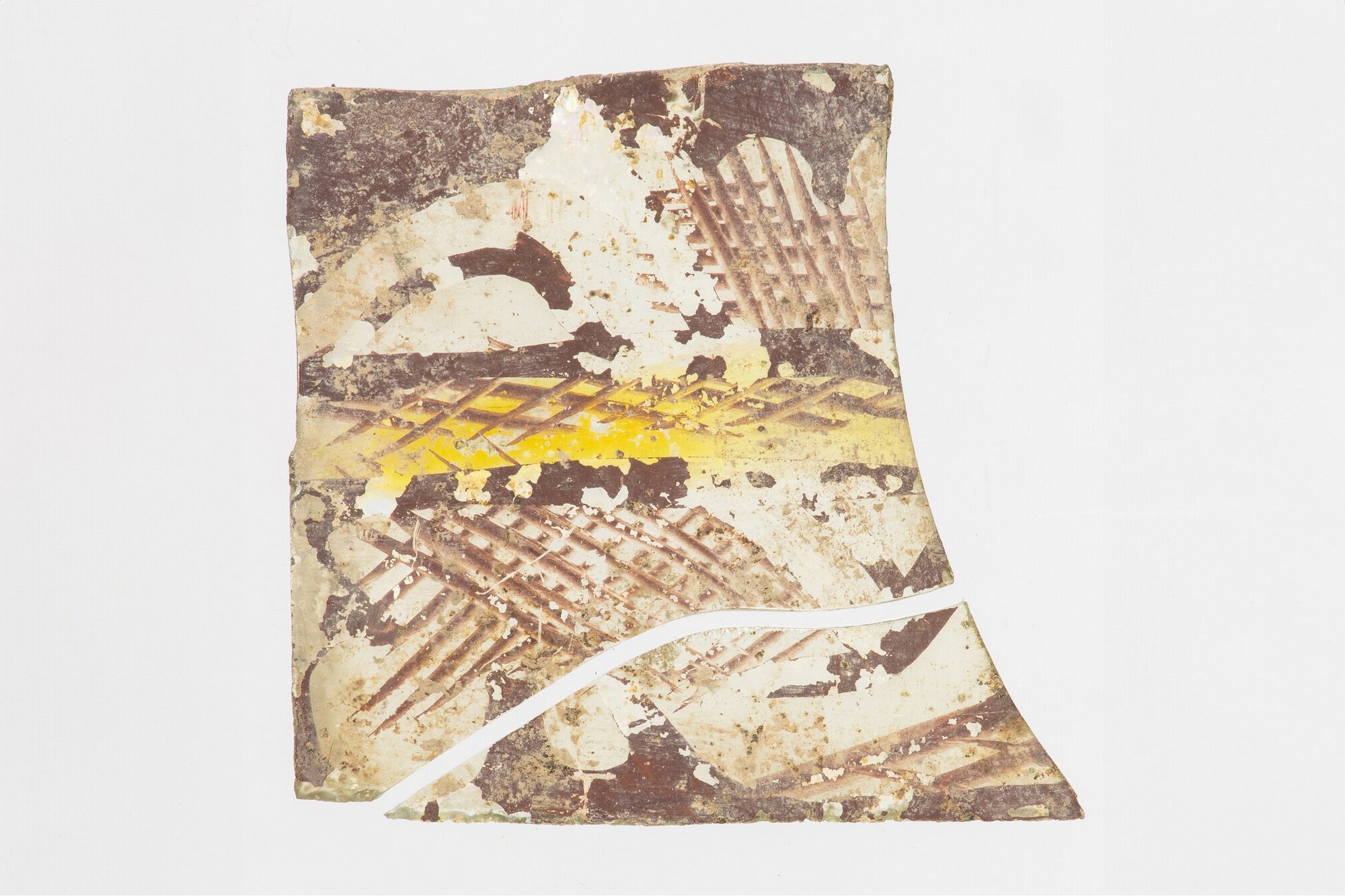 Vensterglas; rechthoek; niet geheel vlak; lichtgroen; gebrandschilderd glas: floraal motief met raster en geel