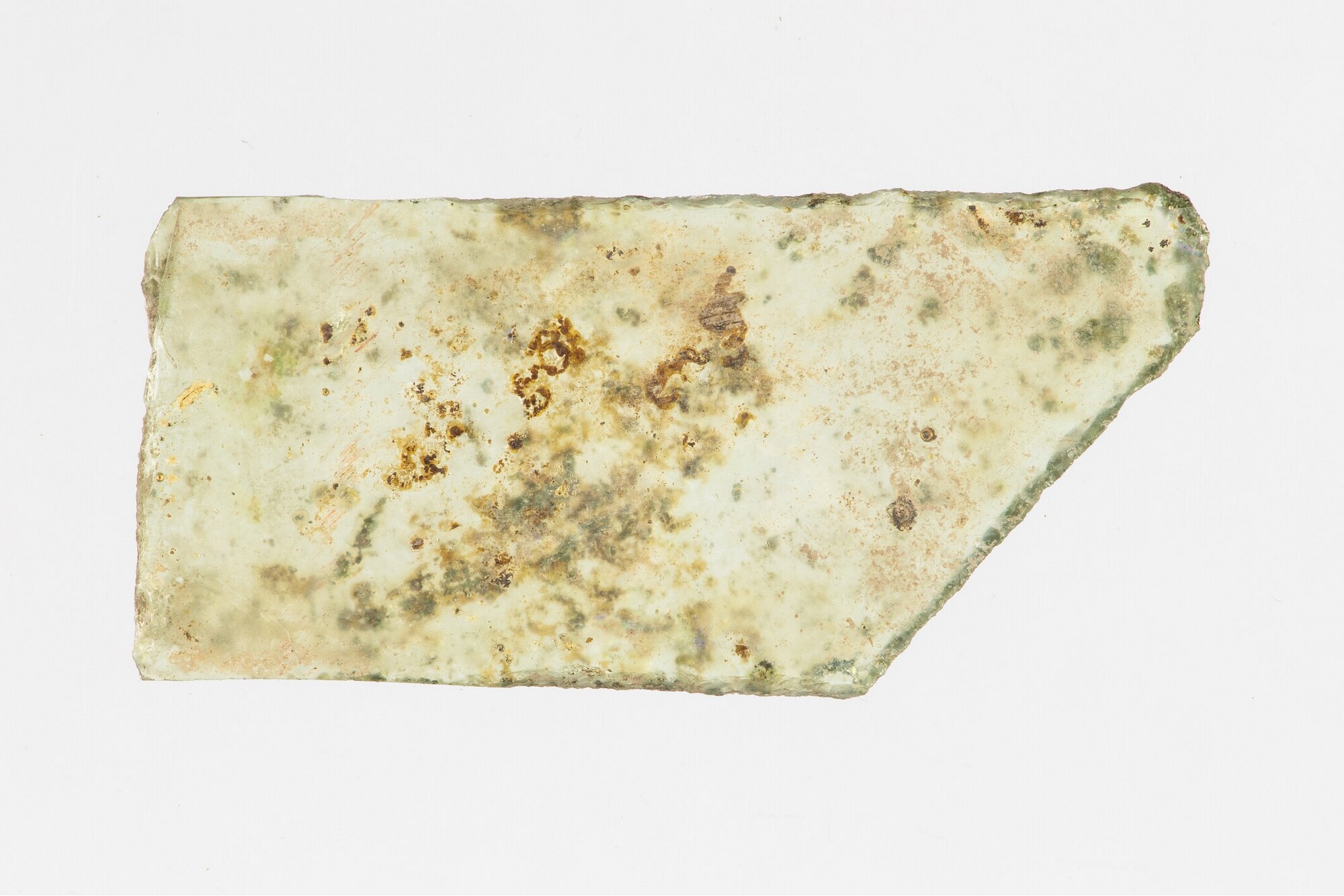 Vensterglas; rechthoek met één schuine korte kant; lichtgroen; glas-in-lood