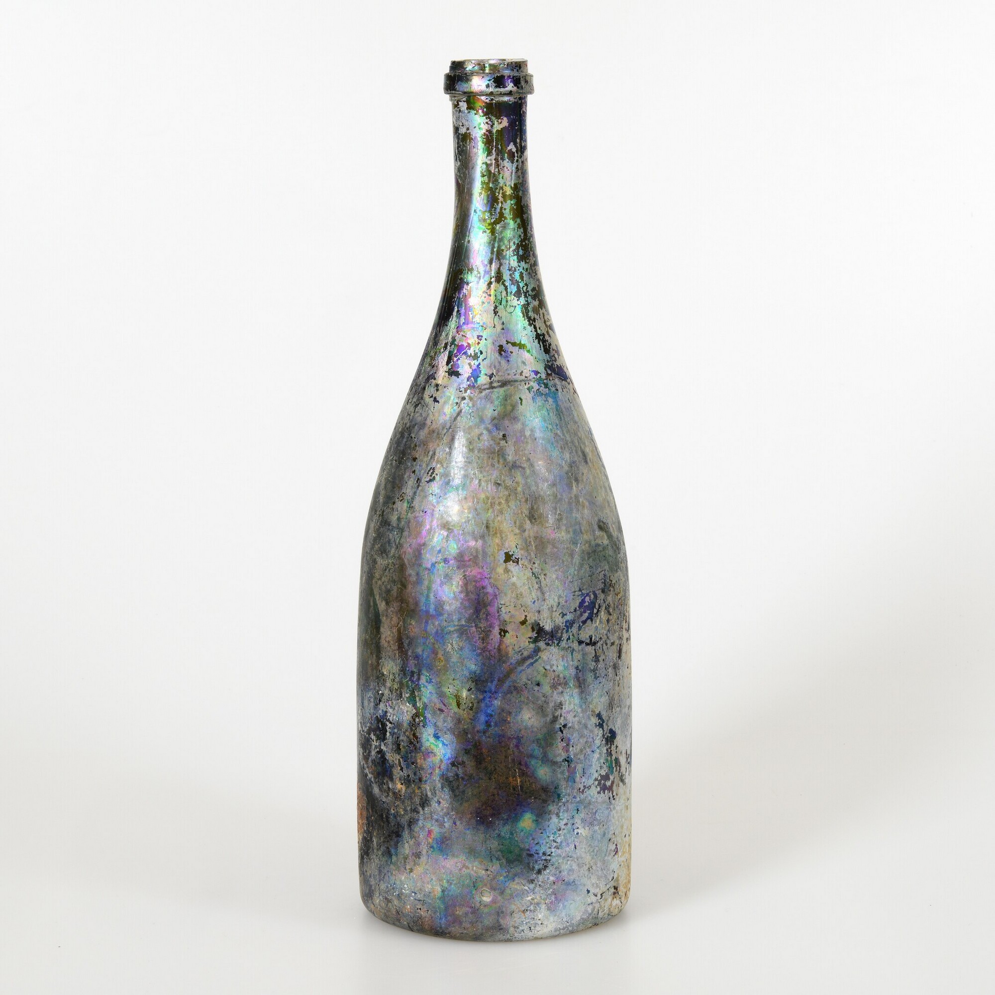 Champagnefles; gl-fle-74; groen glas; brede cilindrische fles met lange hals en afhangende schouder, hoog opgestoken bodem met pontilmerk
