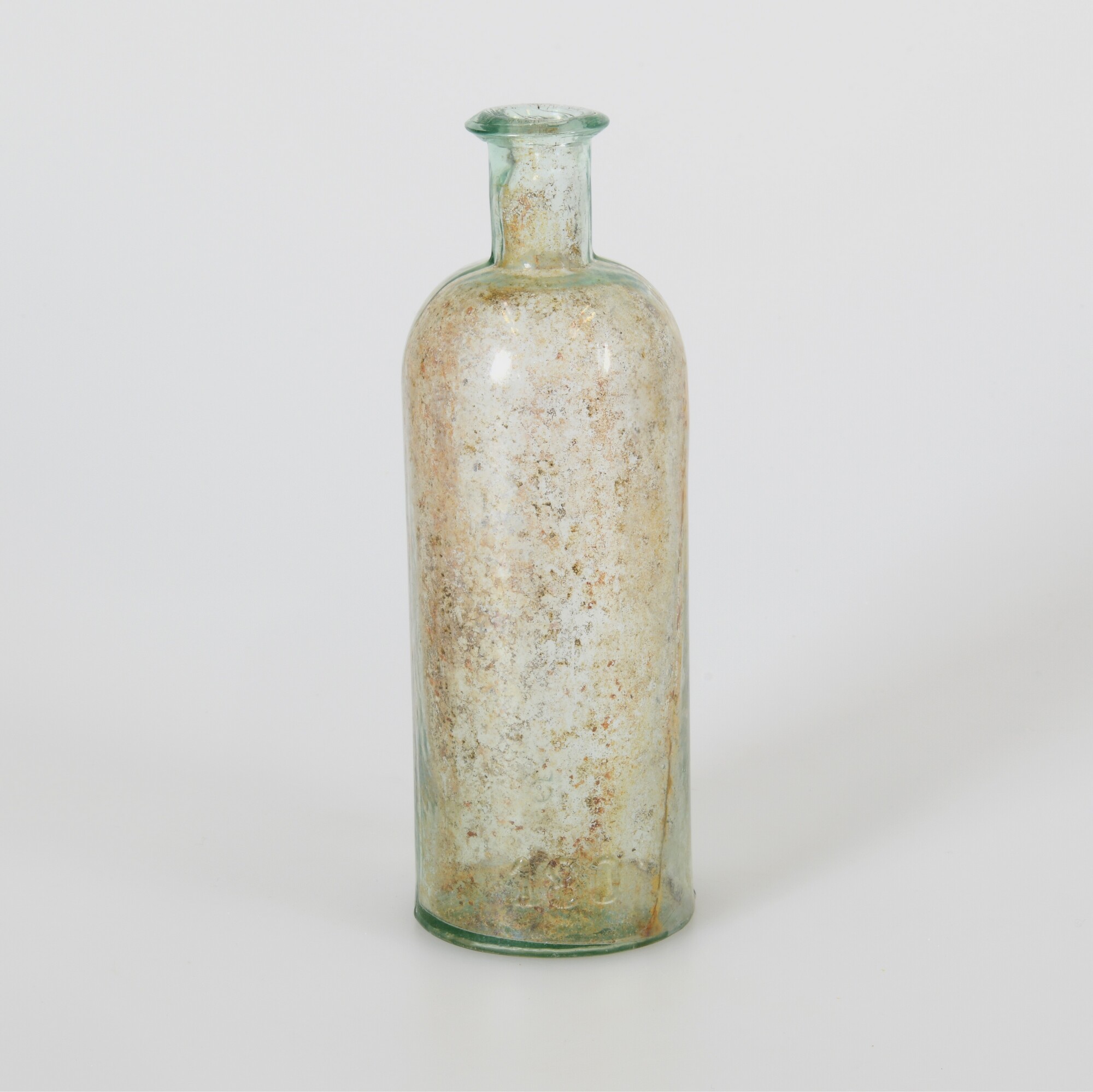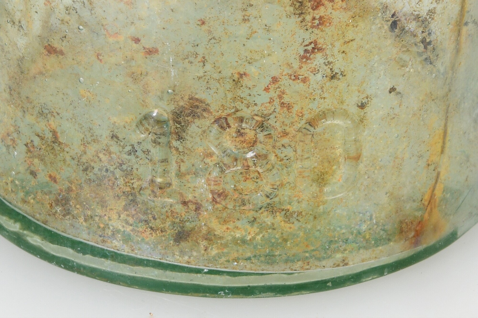 Fles; gl-fle-14; lichtgroen glas; kleine cilindrische fles met afgeronde schouder met korte hals en uitstaande lip, met smalle hals, contactvorm met naden, standvlak; twee verticale naden; nr: 180