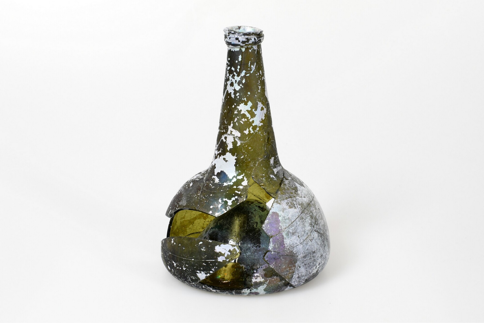 Fles; gl-fle-128; bolvormige wijnfles met lange conische hals en uitgezakte buik met grootste breedte aan de basis, conisch opgestoken bodem met pontilmerk (blaaspijppontil); groen glas; herkomst: Nederlanden