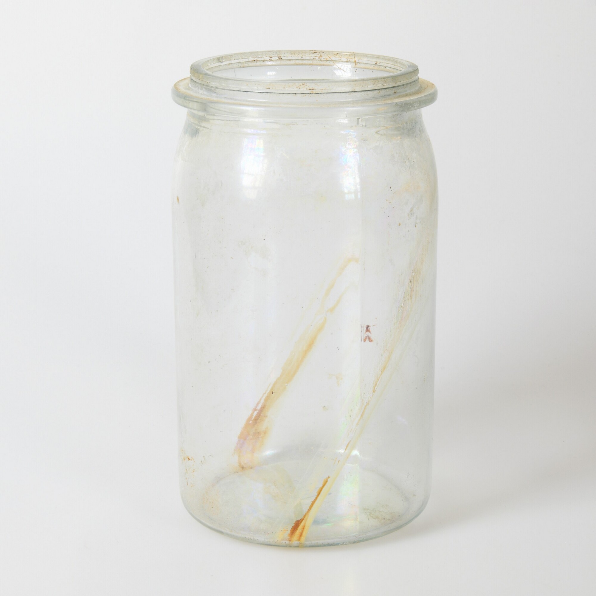 Pot; gl-pot-18; brede dikwandige cilindrische inmaakpot met afgeronde schouder, korte hals met uitstaande richel, contactvorm met naden, hoog model >10cm, standvlak; inhoudsaanduiding 1½ op bodem