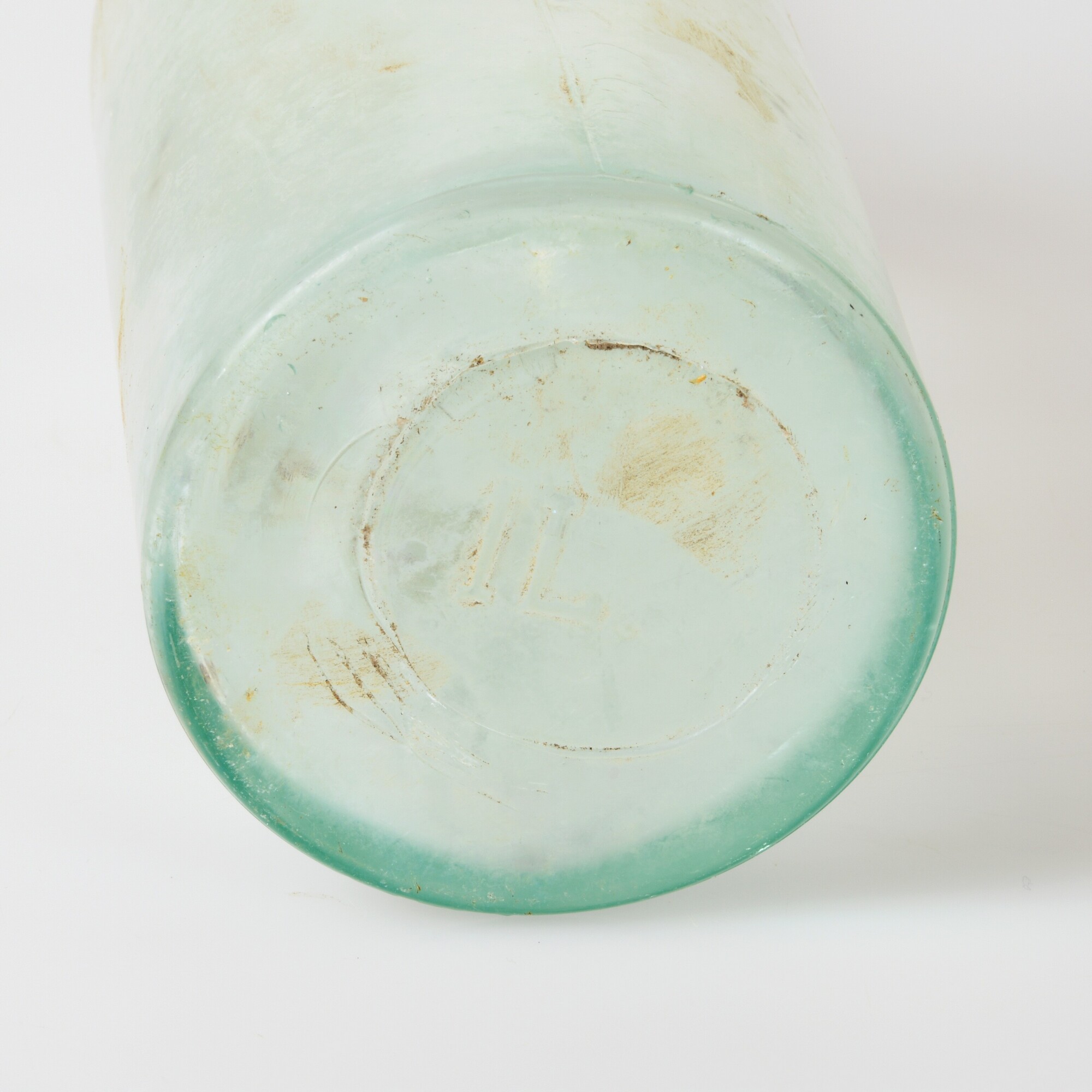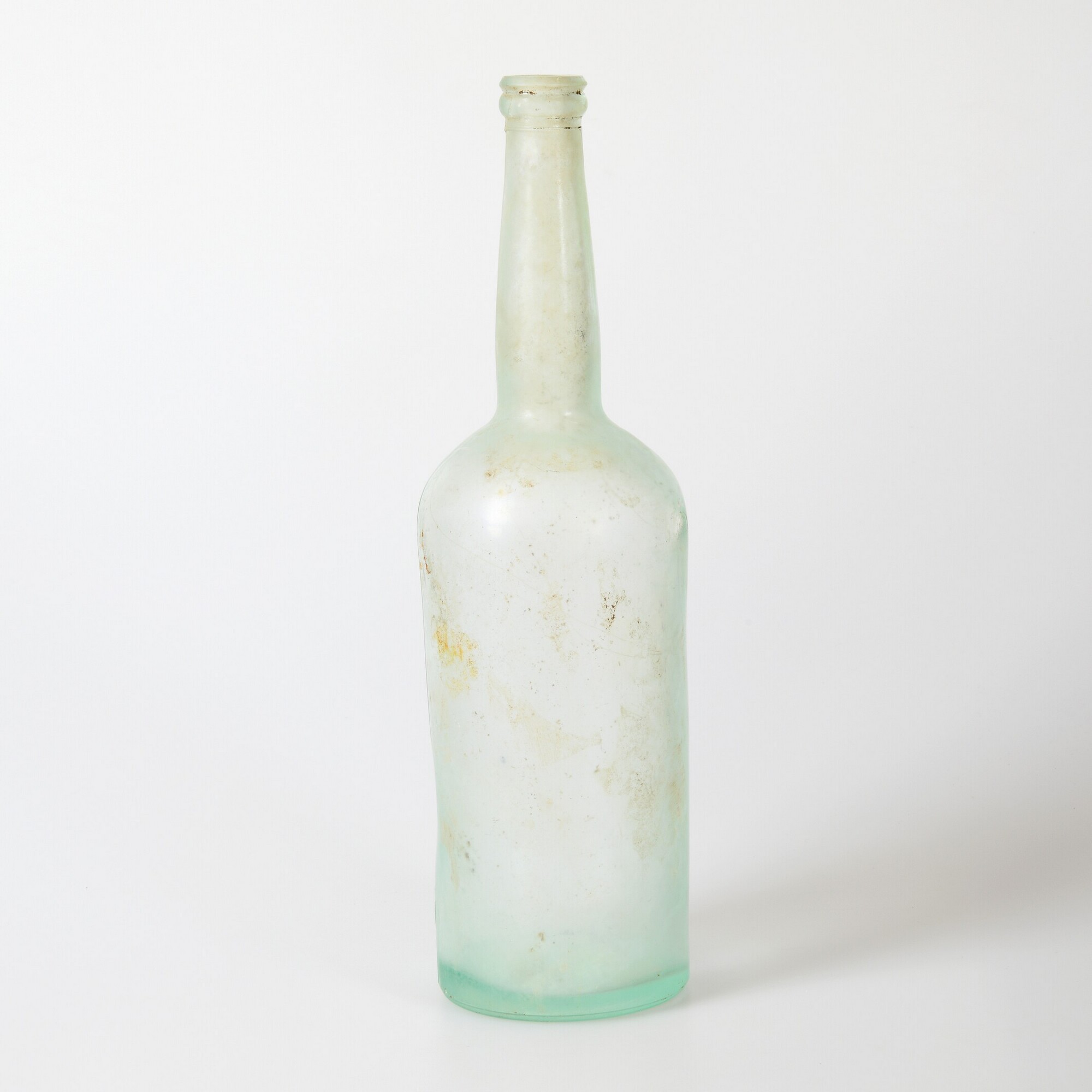 Fles; gl-fle-94; slanke cilindrische wijnfles met lange hals, afhangende afgeronde schouder, afgewerkte platte draad onder de lip, vormgeblazen, licht opgebolde bodem; inhoudsaanduiding op bodem: 1L