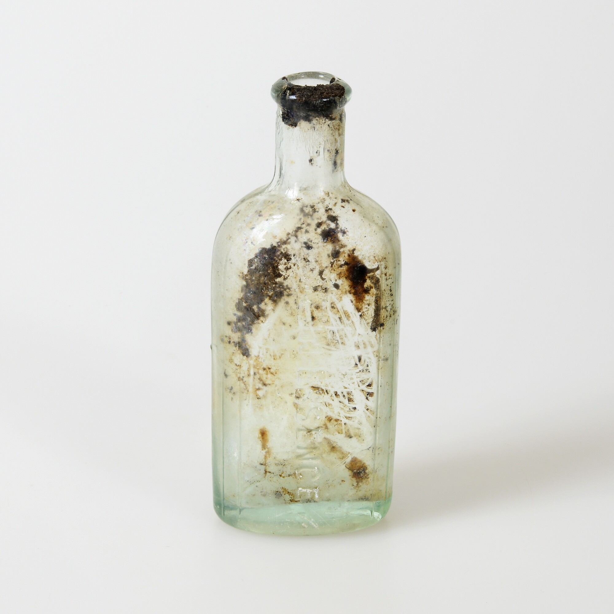 Fles; gl-fle-62; ovale fles met cilindrische hals en afgeronde schouders, twee gebogen ribben, contactvorm met naden, standvlak; in reliëf: azyn-essence; op bodem: L05