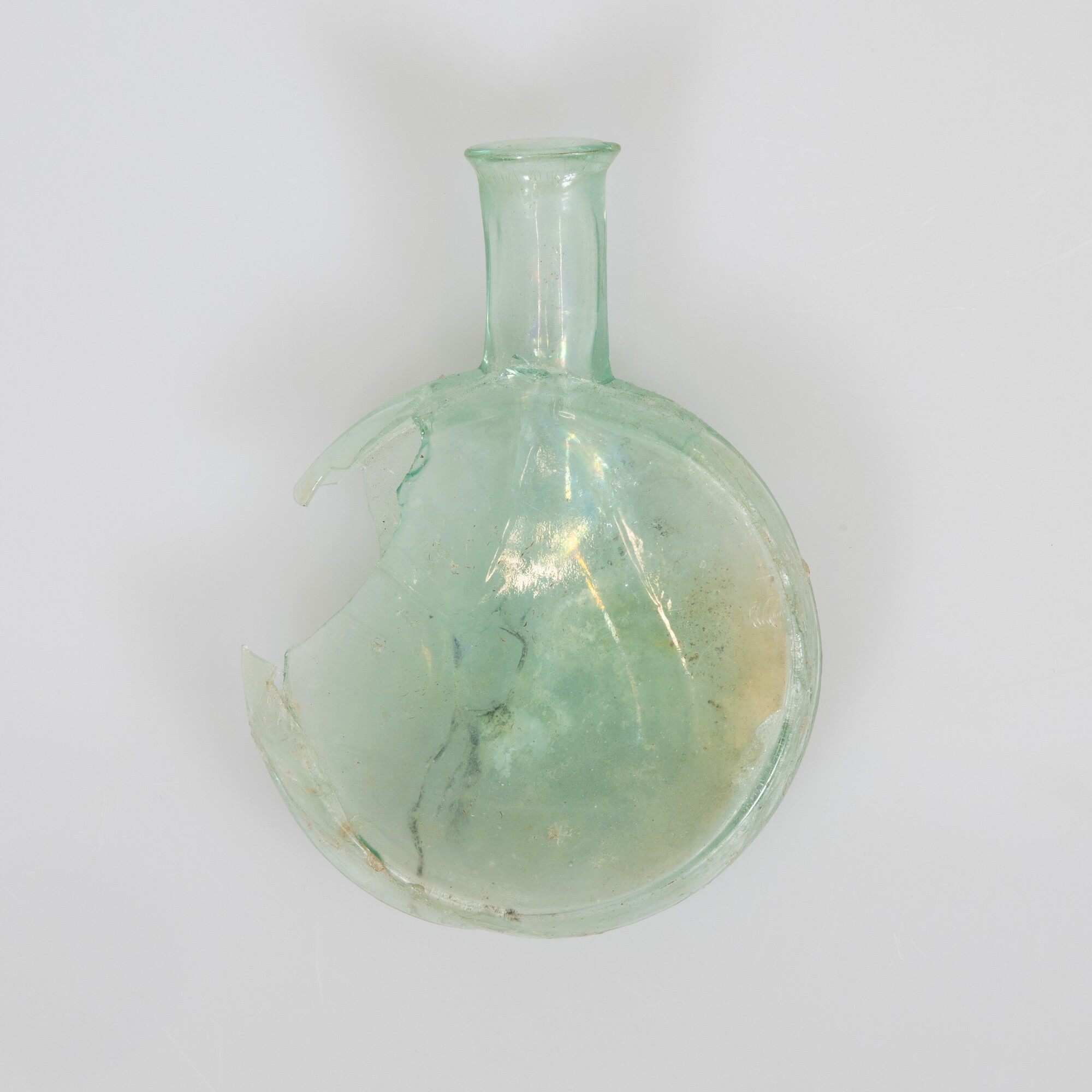 Fles, medicijnfles; gl-fle-110; ronde fles met twee platte zijden, korte hals met verdikte- of omgeslagen lip, contactvorm met naad, vormgeblazen; blauwgroen glas