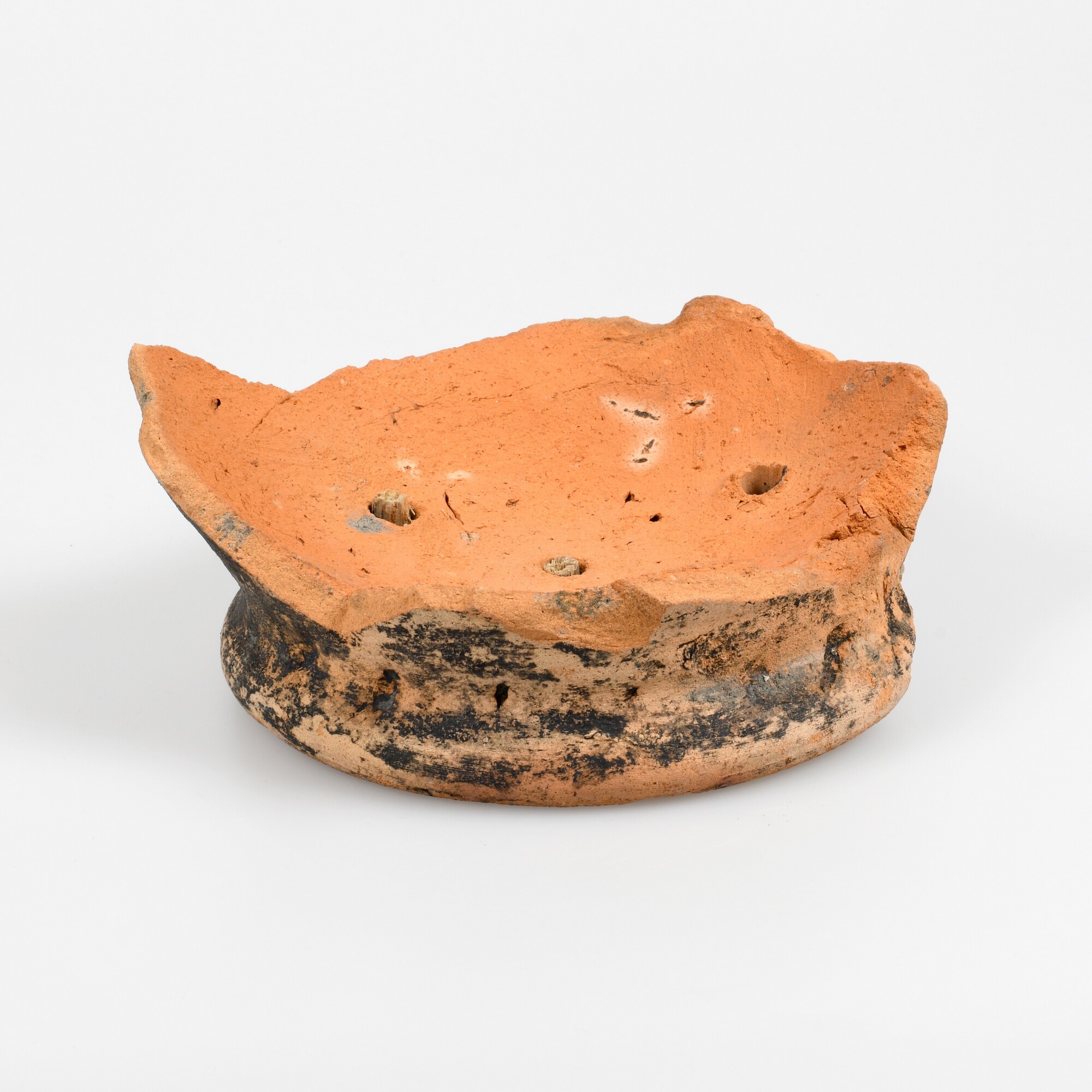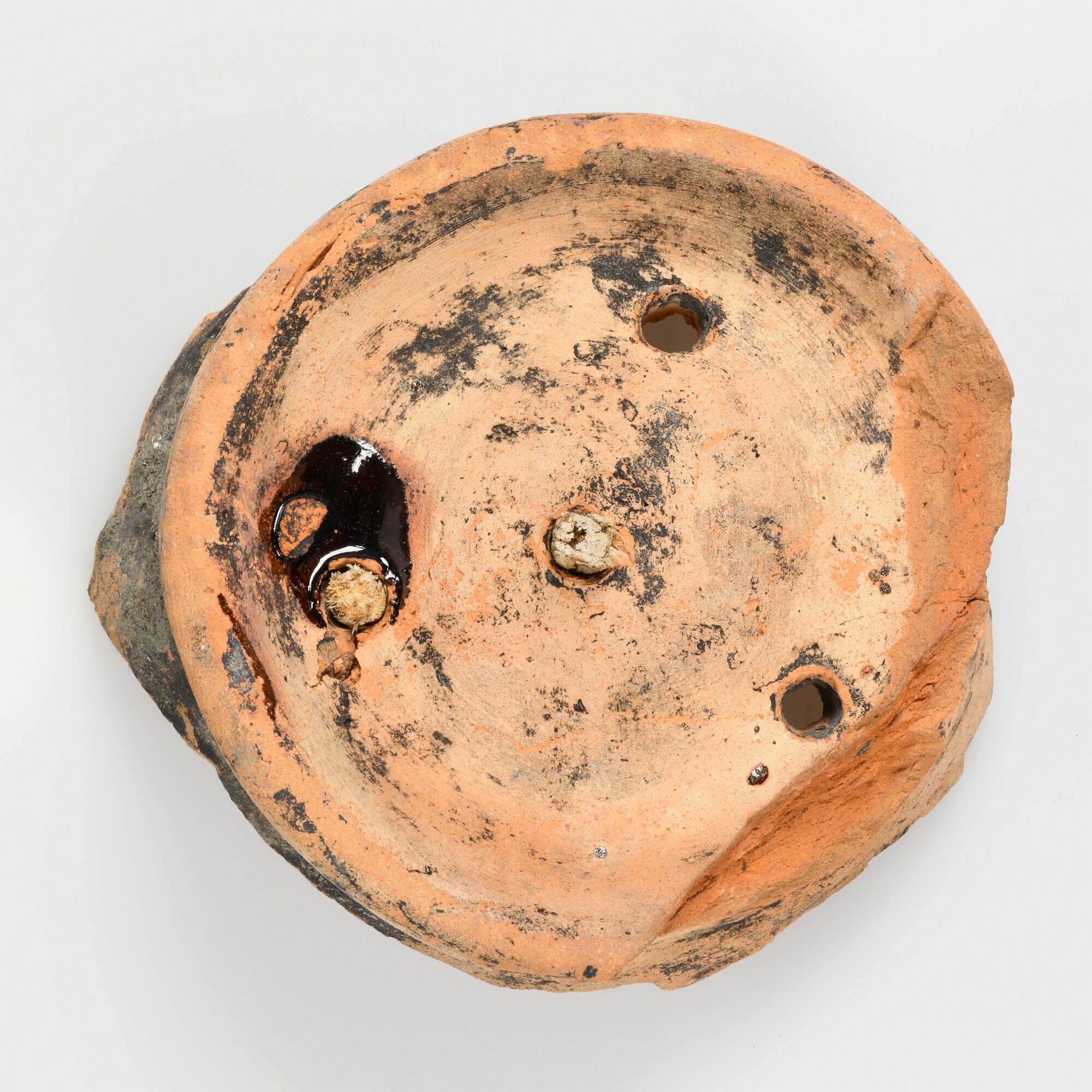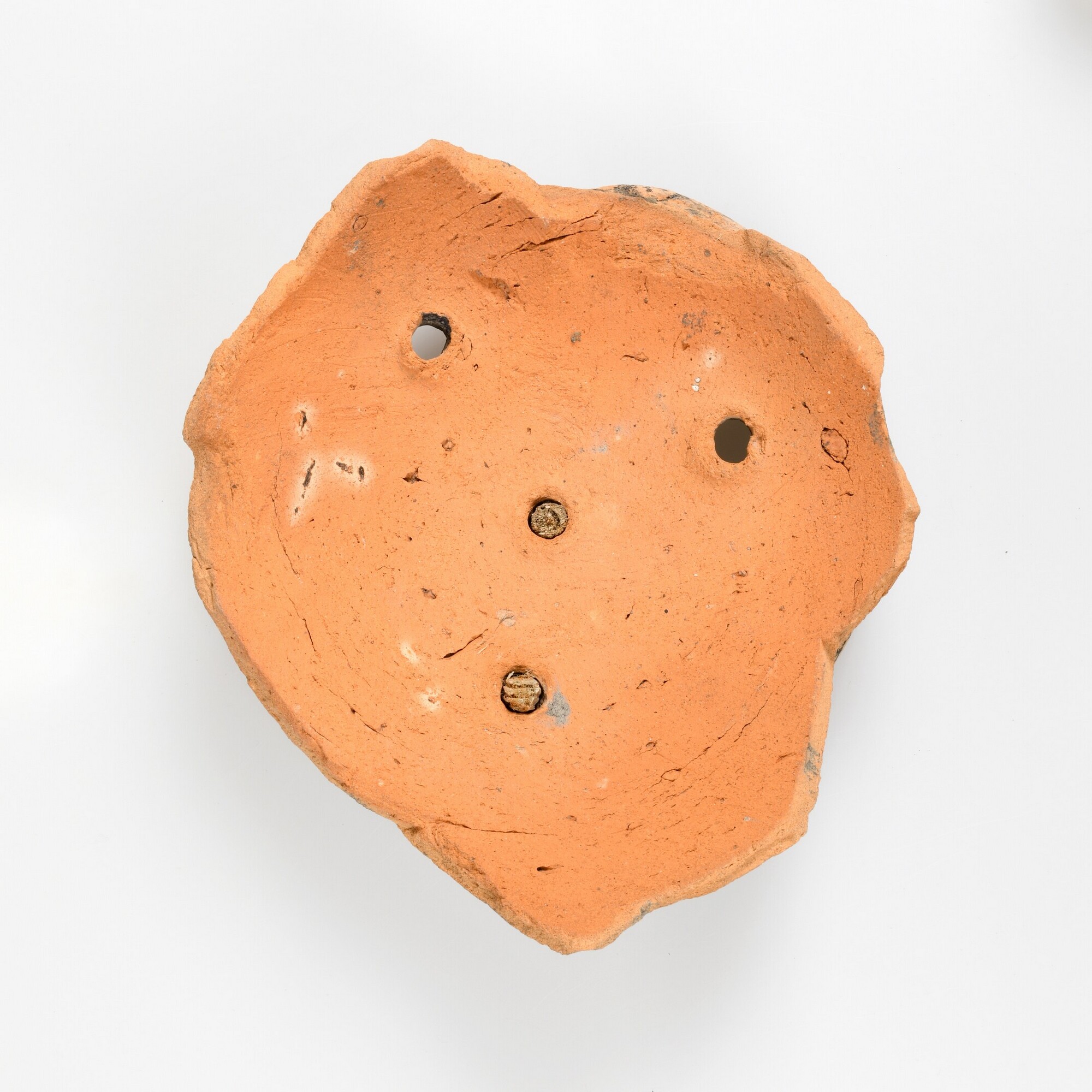 Bloempot (bodemfragment); r-blo-; ongeglazuurd roodbakkend aardewerk; standring; vier gaten in bodem, waaronder twee met houten pennen erin; herkomst: Nederland