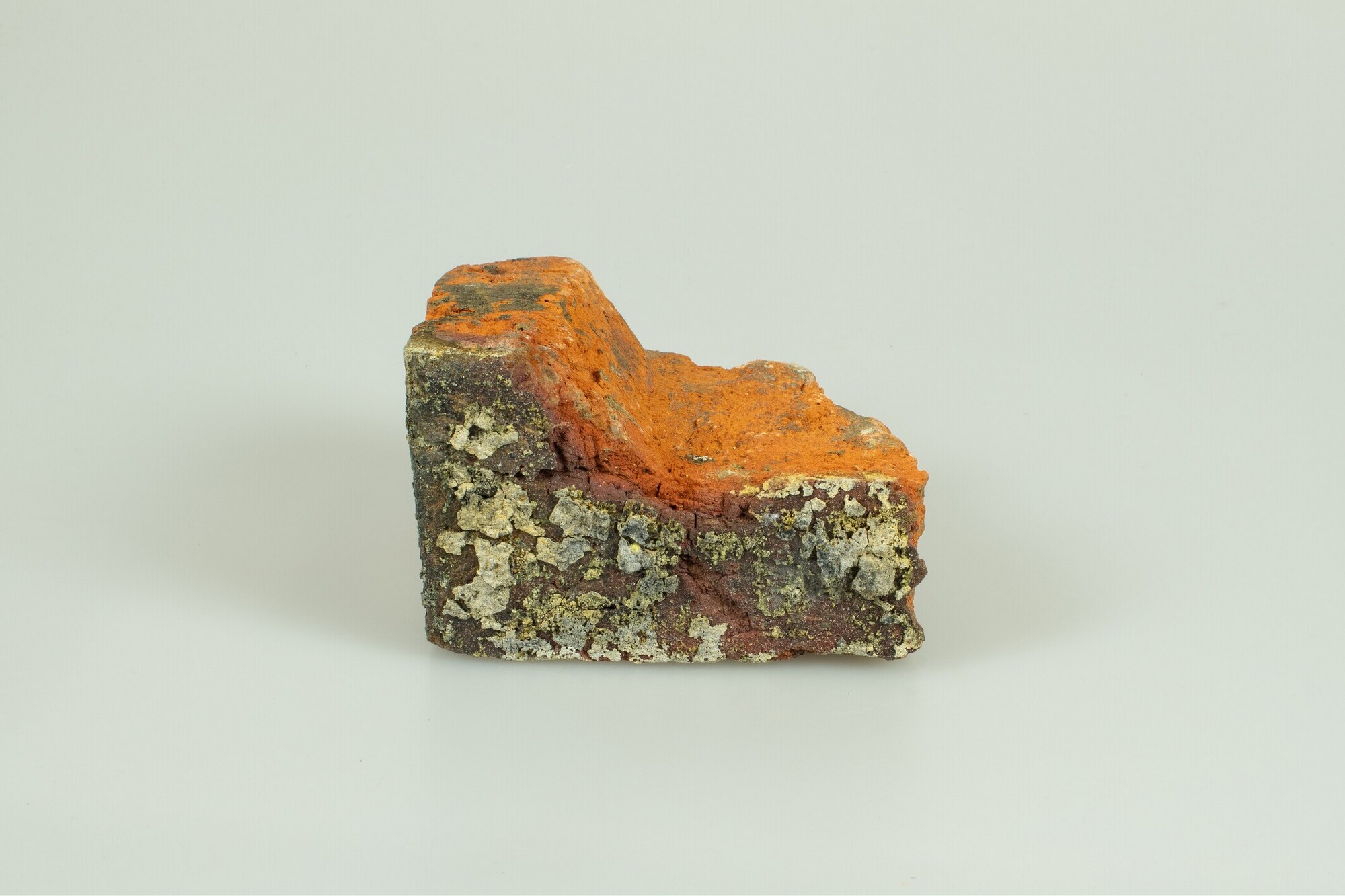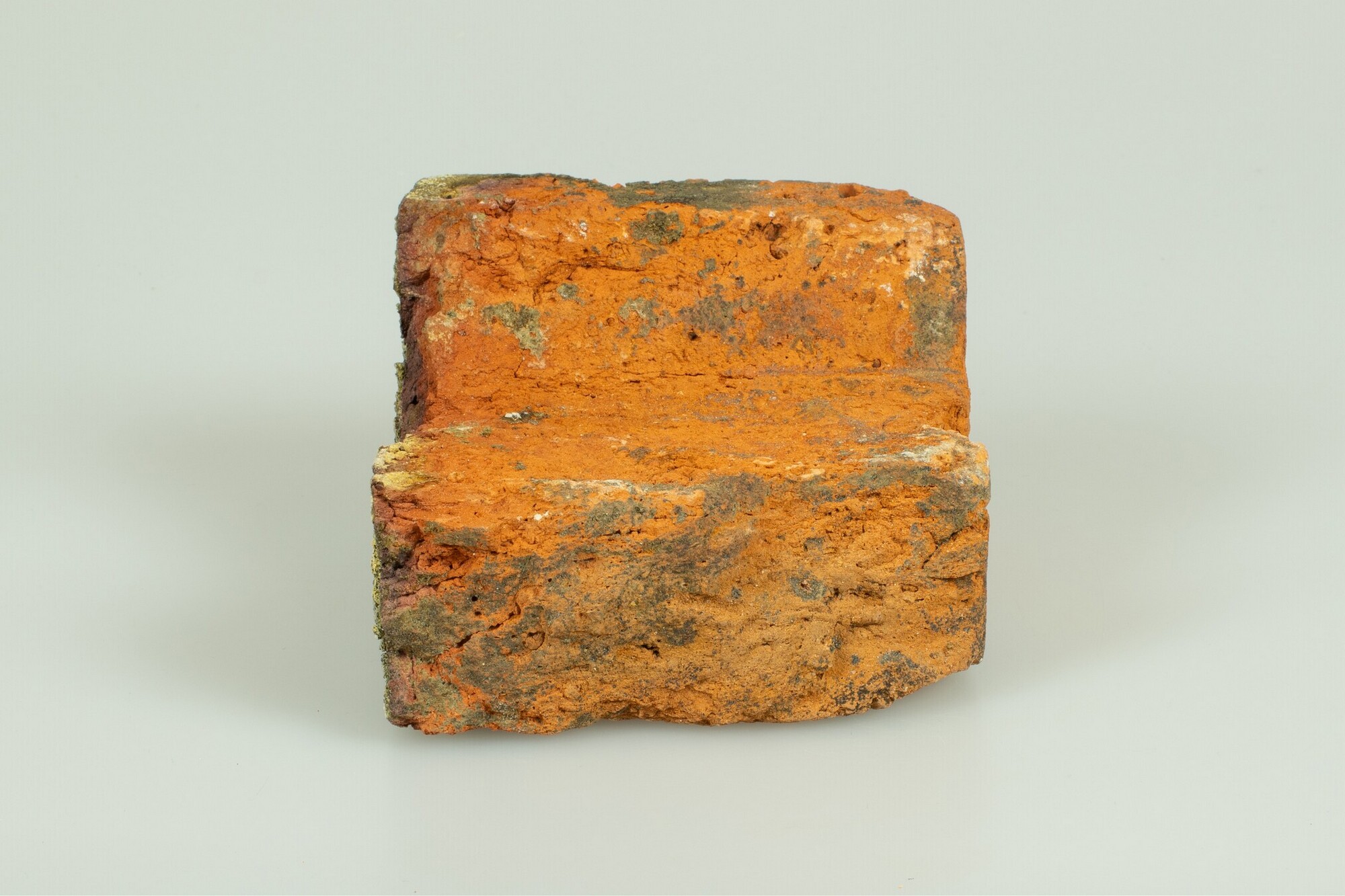 Roostersteen (fragment); roodbakkend aardewerk; ongeglazuurd; rechthoekig met opstaande rand; grof baksel met een gesinterde zijkant (sterk verhit geweest); afkomstig uit brouwerij; herkomst: Nederland