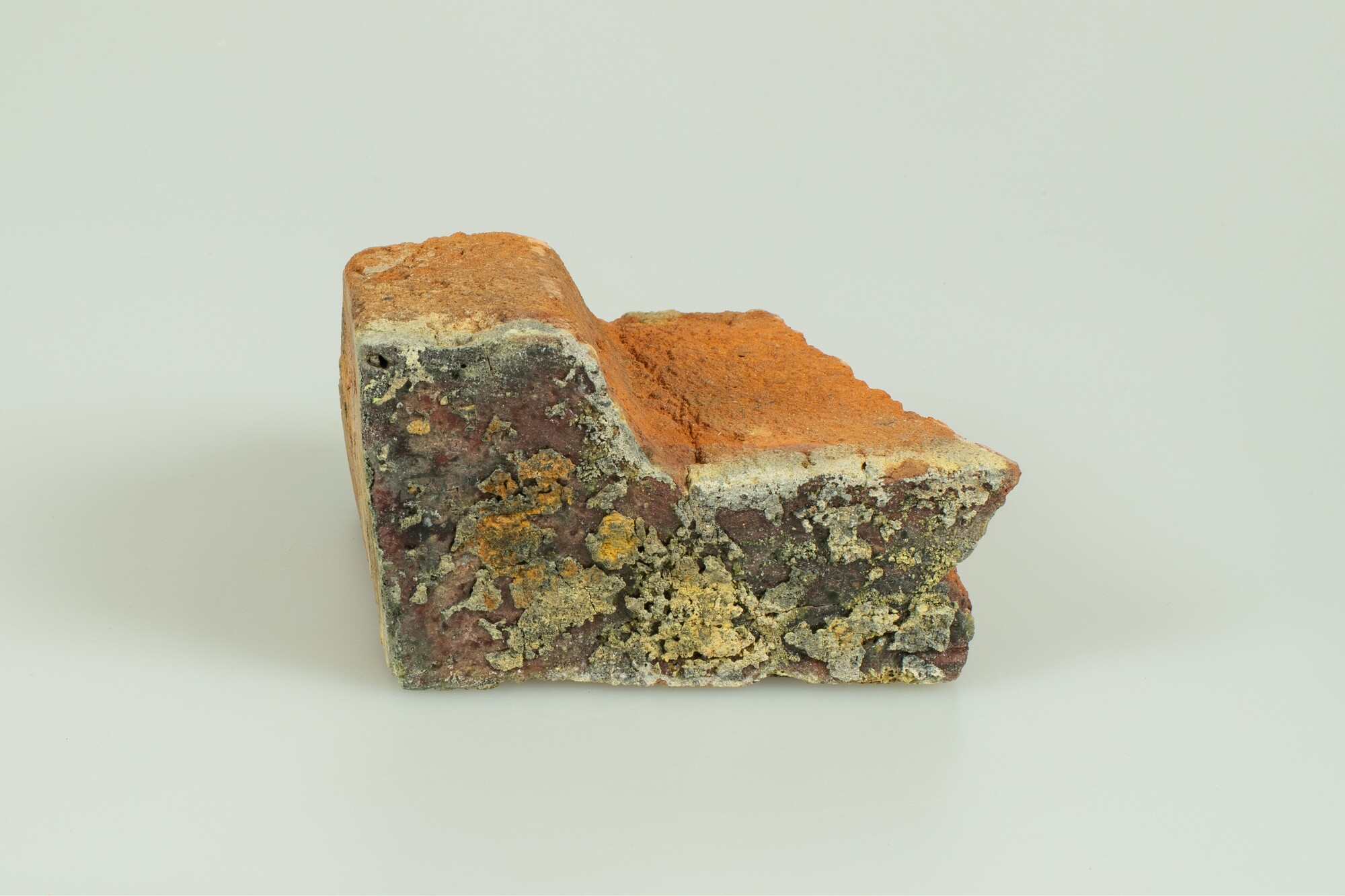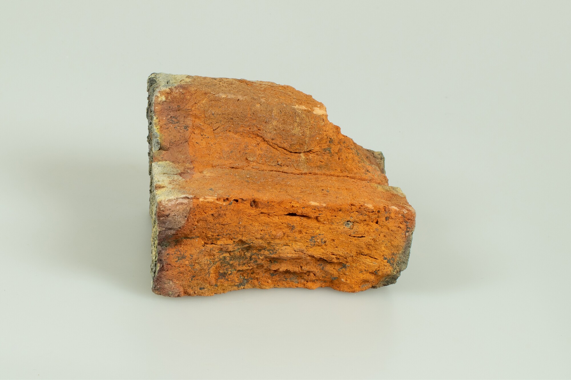 Roostersteen (fragment); roodbakkend aardewerk; ongeglazuurd; rechthoekig met opstaande rand; grof baksel met een gesinterde zijkant (sterk verhit geweest); afkomstig uit brouwerij; herkomst: Nederland