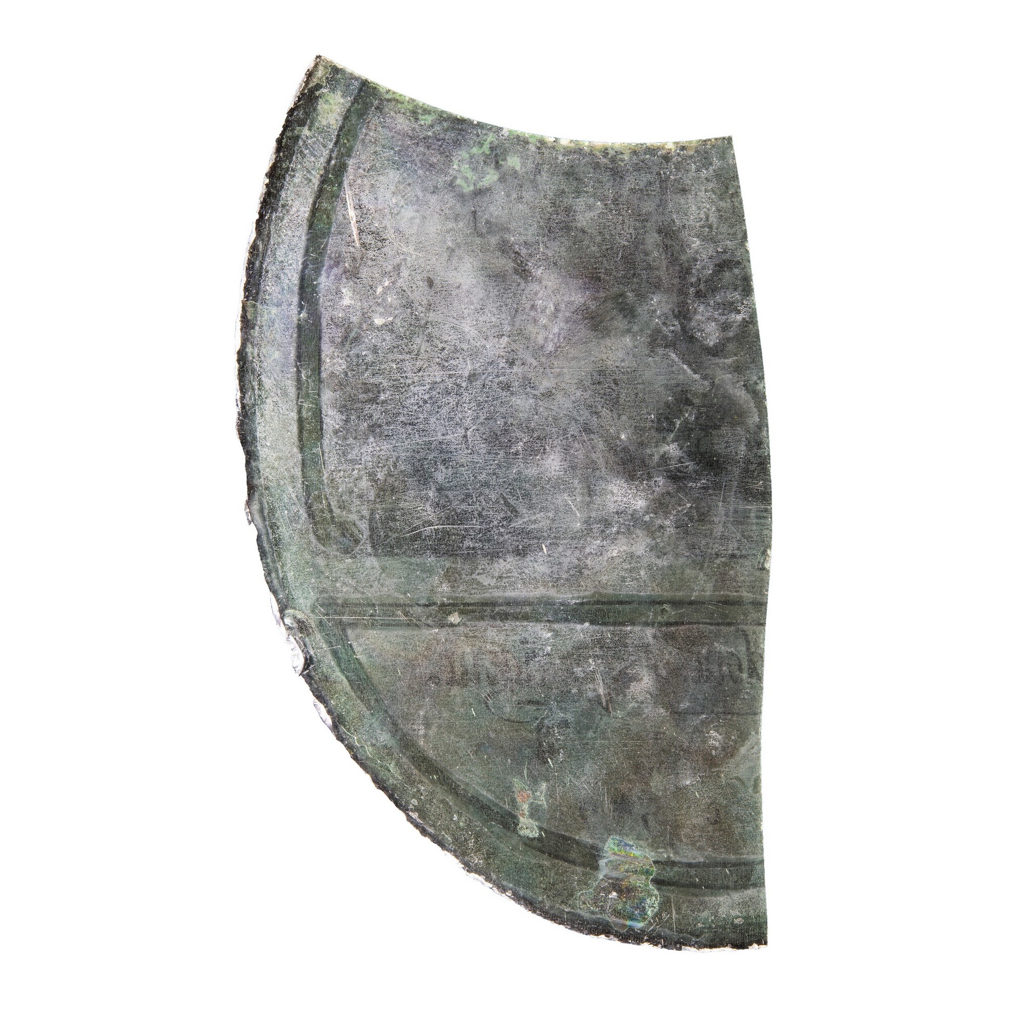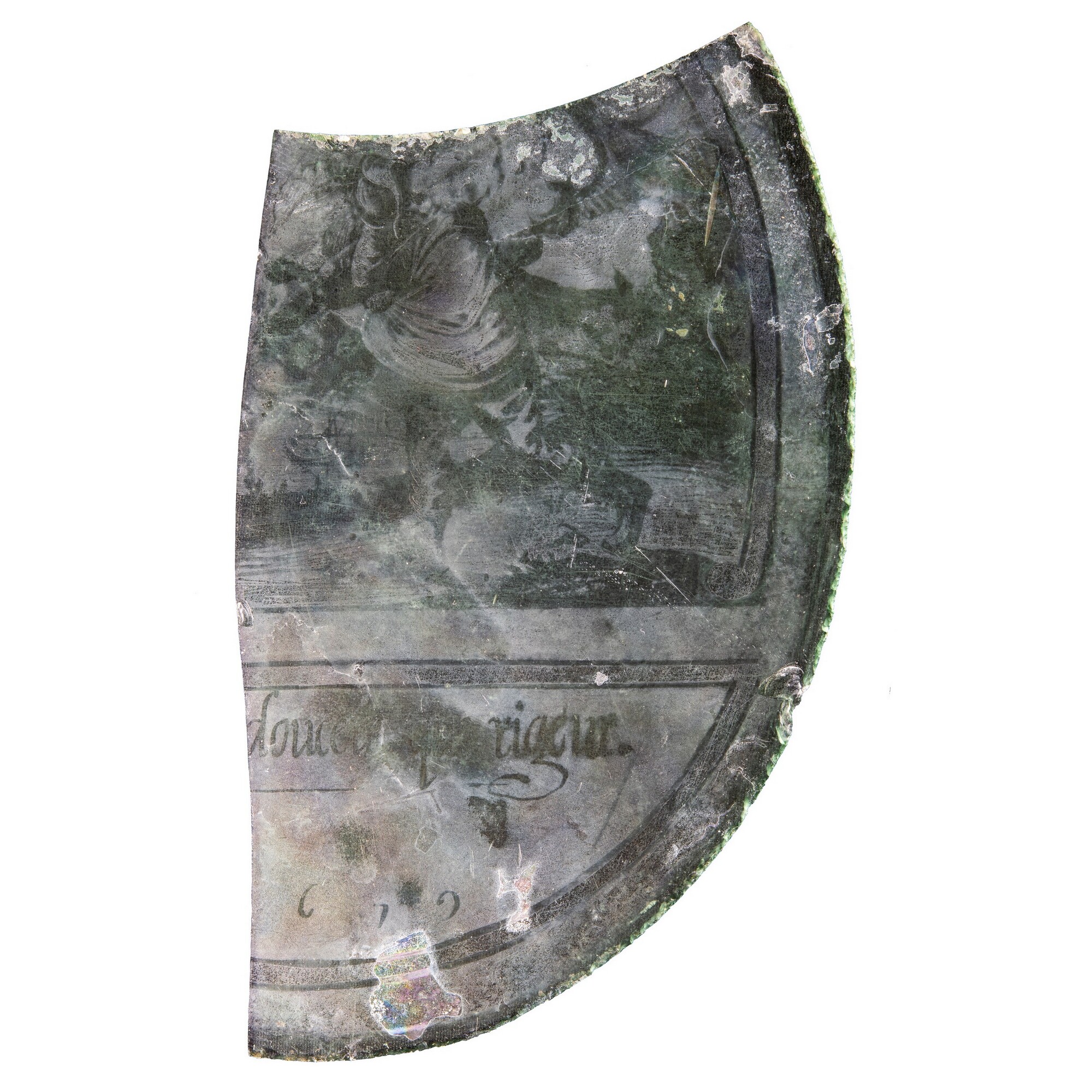 Vensterglas (fragment); rond (rondeel); lichtblauwgroen glas; gebrandschilderd glas: halfronde cartouche met voorstelling van een lopende man die zijn hoed afneemt tegen de achtergrond van een haven met een vissersschip, daaronder halfronde cartouche met inscriptie: ‘...douceur que rigeur’ en [1]619, deel van de zin 'Plus peut douceur que rigeur' (zachtheid is veel beter dan hardheid); herkomst: ...
